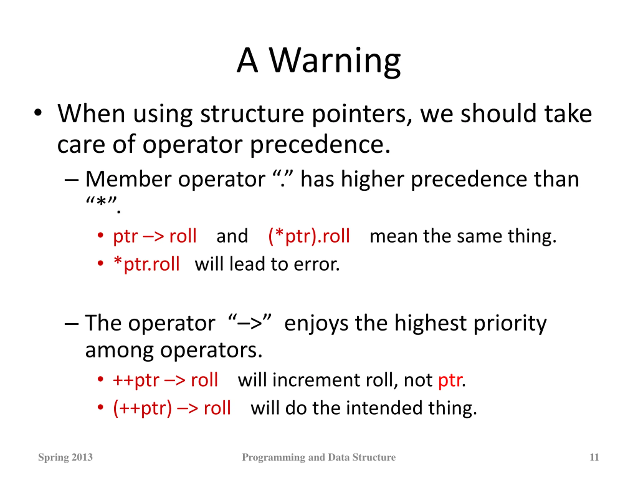 A Warning When using structure pointers, we should take care of operator precedence. Member operator . has higher precedence than * . ptr > roll and (*ptr).roll mean the same thing. *ptr.roll will lead to error. The operator > enjoys the highest priority among operators. ++ptr > roll will increment roll, not ptr. (++ptr) > roll will do the intended thing. Spring 2013 Programming and Data Structure 11