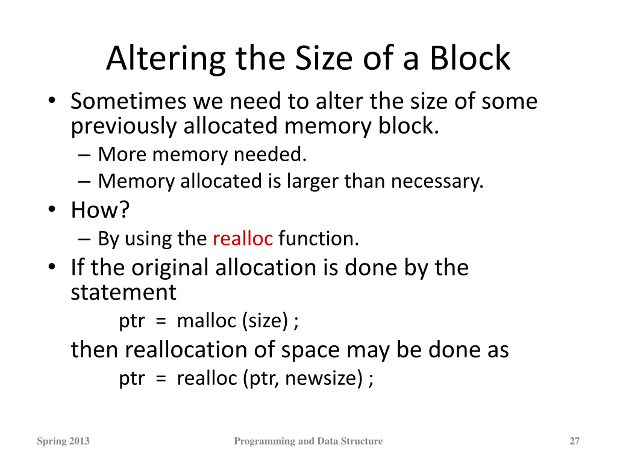 Releasing the Used Space When we no longer need the data stored in a block of memory, we may release the block for future use. How? By using the free function. General format: free (ptr) ; where ptr is a pointer to a memory block which has been already created using malloc. Spring 2013 Programming and Data Structure 26