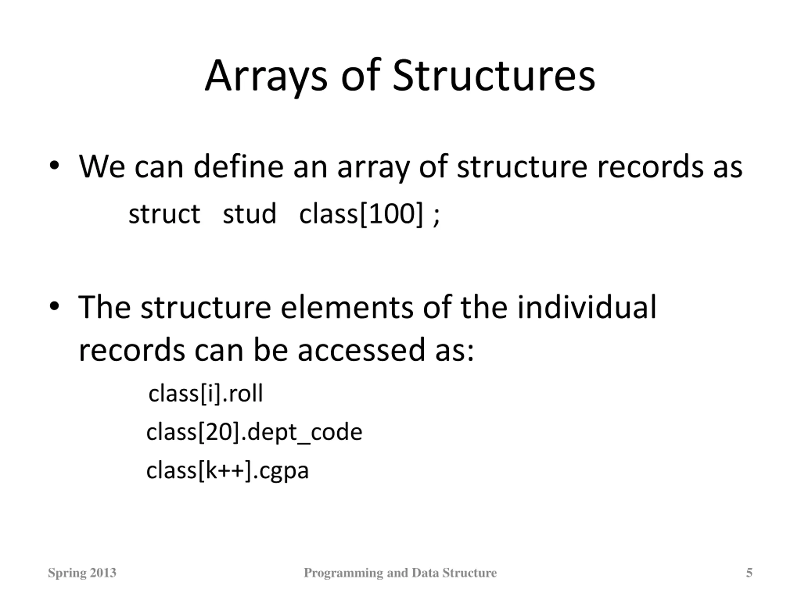 Structures Revisited Recall that a structure can be declared as: struct stud { int roll; char dept_code[25]; float cgpa; }; struct stud a, b, c; And the individual structure elements can be accessed as: a.roll , b.roll , c.cgpa , etc. Spring 2013 Programming and Data Structure 4