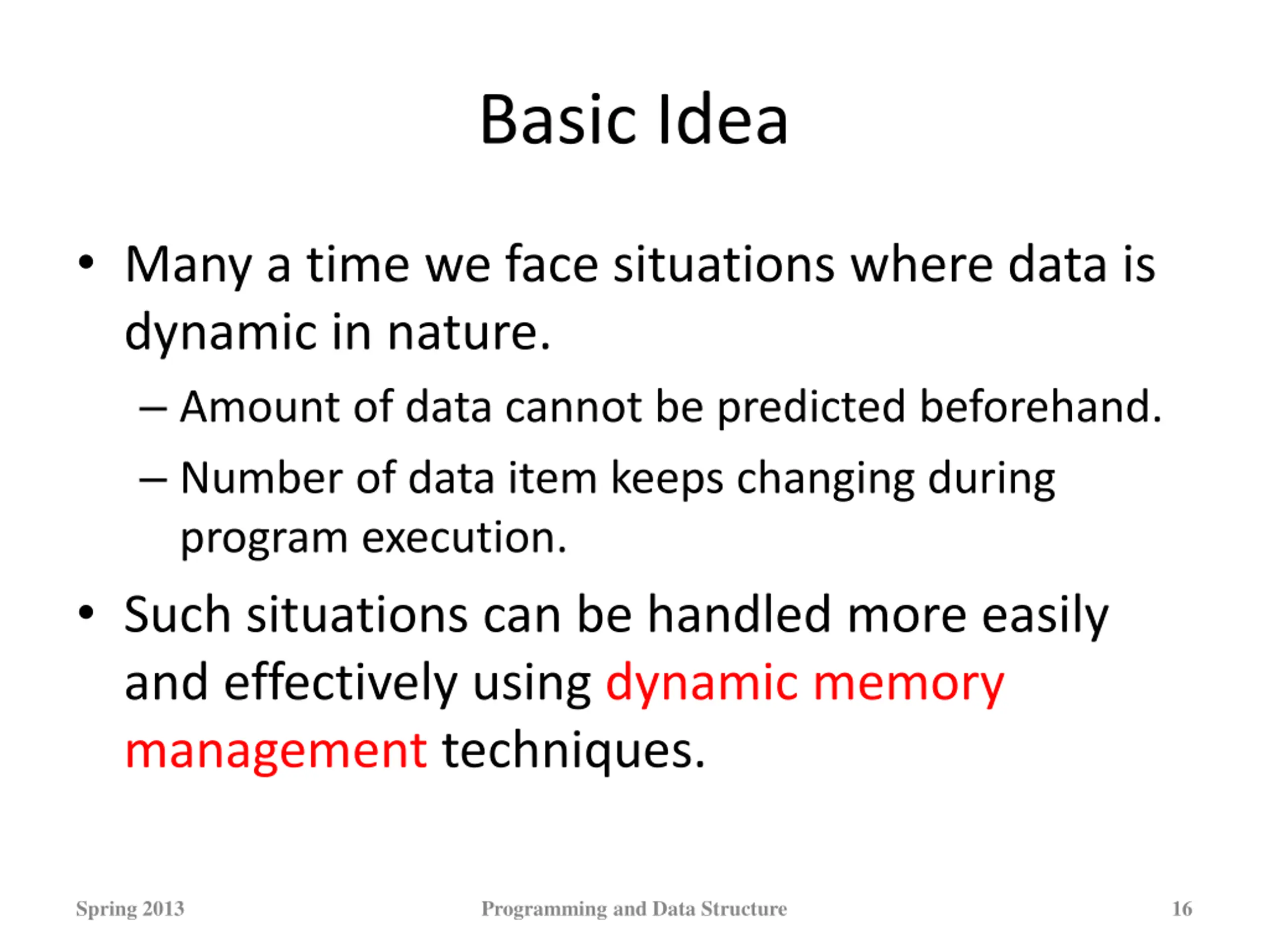 Basic Idea Many a time we face situations where data is dynamic in nature. Amount of data cannot be predicted beforehand. Number of data item keeps changing during program execution. Such situations can be handled more easily and effectively using dynamic memory management techniques. Spring 2013 Programming and Data Structure 16