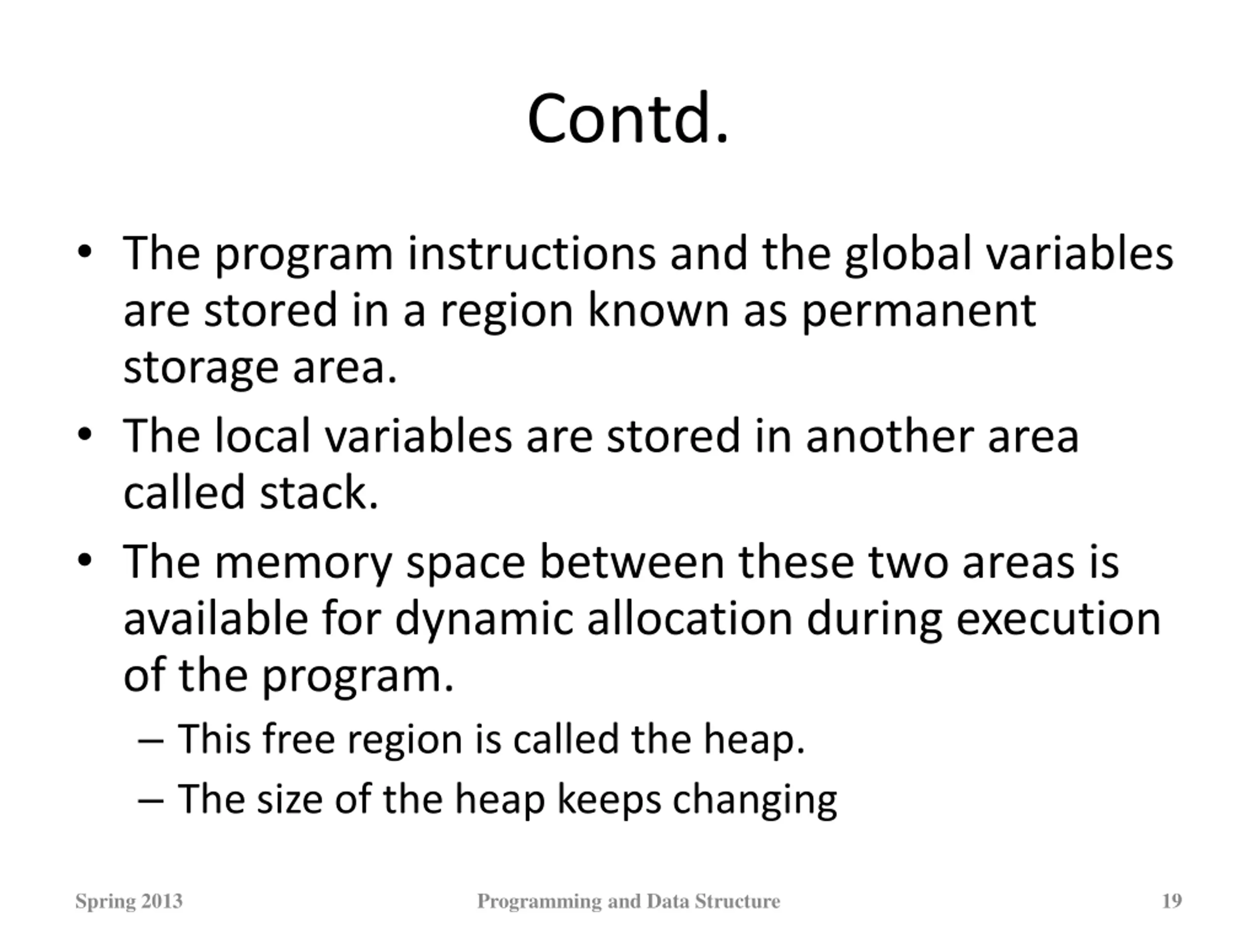 Contd. The program instructions and the global variables are stored in a region known as permanent storage area. The local variables are stored in another area called stack. The memory space between these two areas is available for dynamic allocation during execution of the program. This free region is called the heap. The size of the heap keeps changing Spring 2013 Programming and Data Structure 19