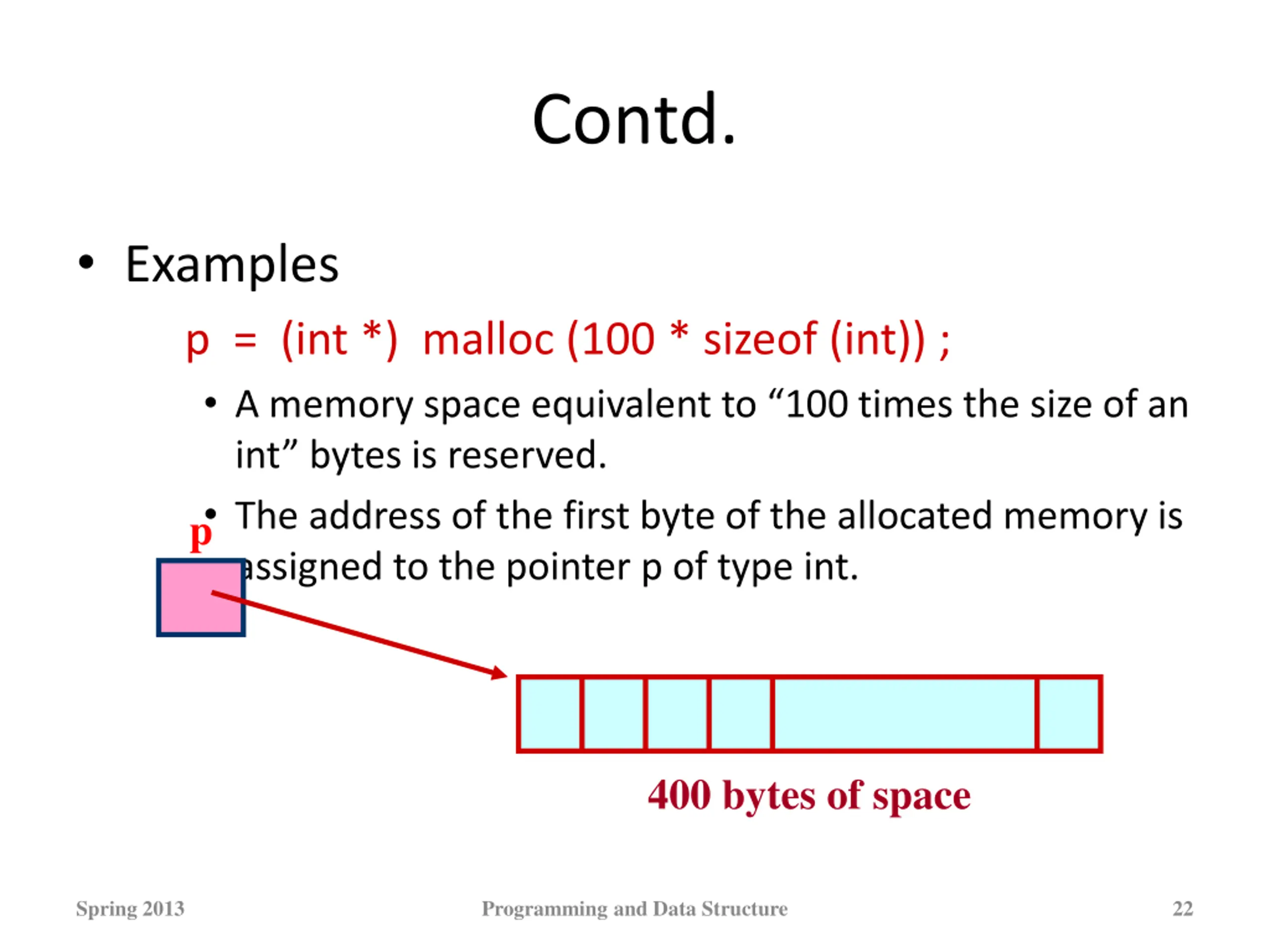 Contd. Examples p = (int *) malloc (100 * sizeof (int)) ; A memory space equivalent to 100 times the size of an int bytes is reserved. The address of the first byte of the allocated memory is assigned to the pointer p of type int. p 400 bytes of space Spring 2013 Programming and Data Structure 22