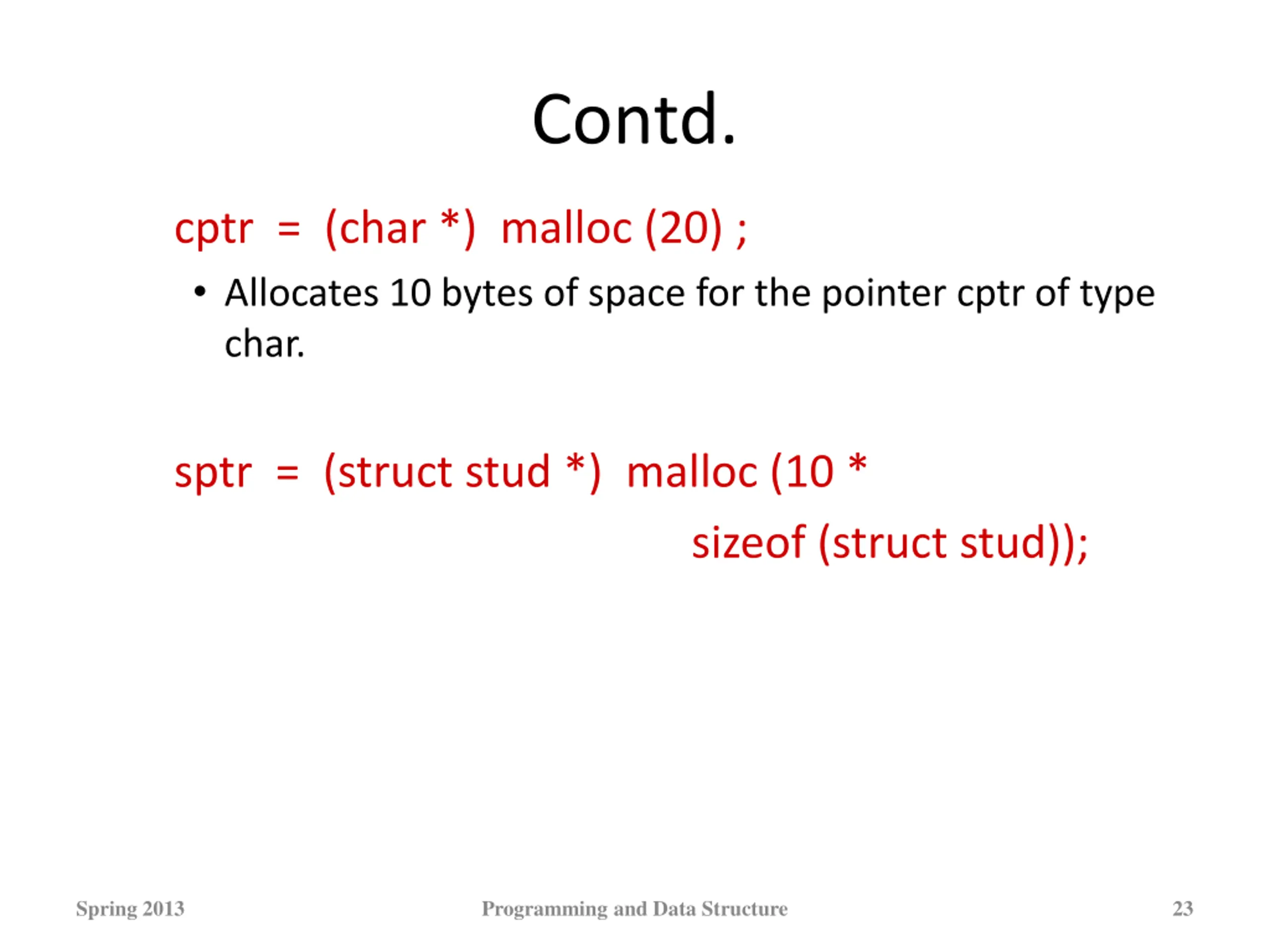 Contd. cptr = (char *) malloc (20) ; Allocates 10 bytes of space for the pointer cptr of type char. sptr = (struct stud *) malloc (10 * sizeof (struct stud)); Spring 2013 Programming and Data Structure 23