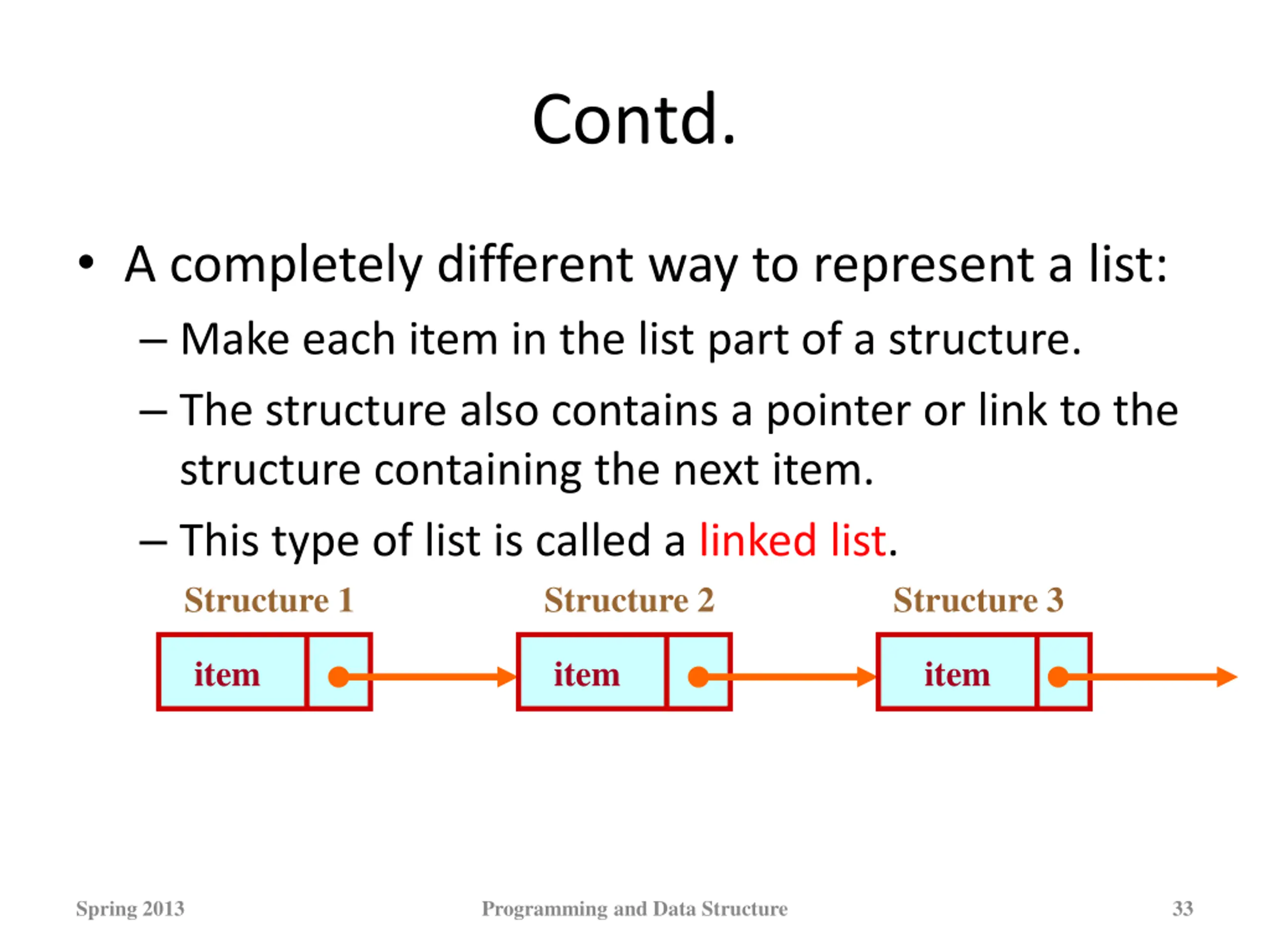 Contd. A completely different way to represent a list: Make each item in the list part of a structure. The structure also contains a pointer or link to the structure containing the next item. This type of list is called a linked list. Structure 1 Structure 2 Structure 3 item item item Spring 2013 Programming and Data Structure 33