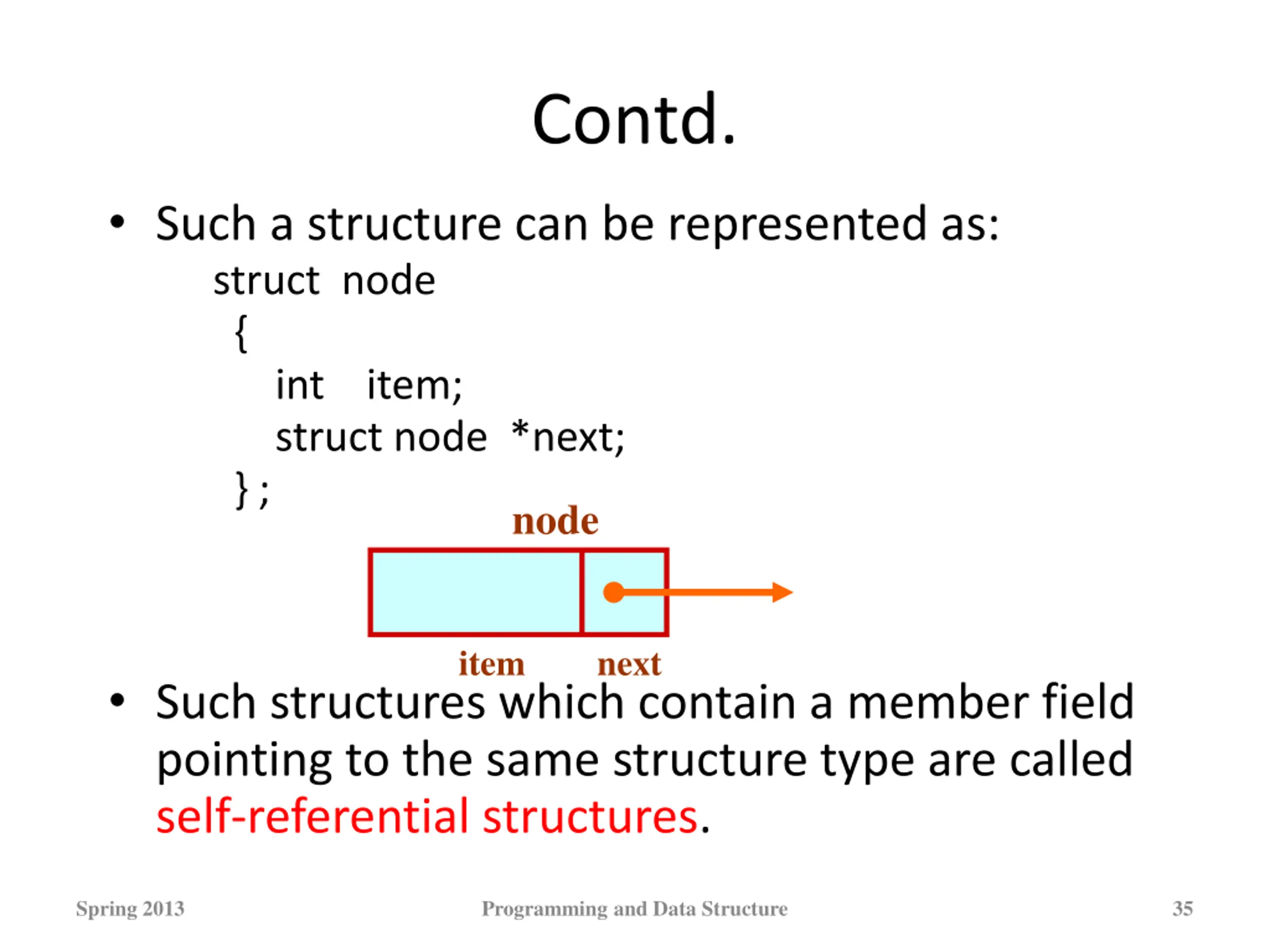 Contd. Each structure of the list is called a node, and consists of two fields: One containing the item. The other containing the address of the next item in the list. The data items comprising a linked list need not be contiguous in memory. They are ordered by logical links that are stored as part of the data in the structure itself. The link is a pointer to another structure of the same type. Spring 2013 Programming and Data Structure 34