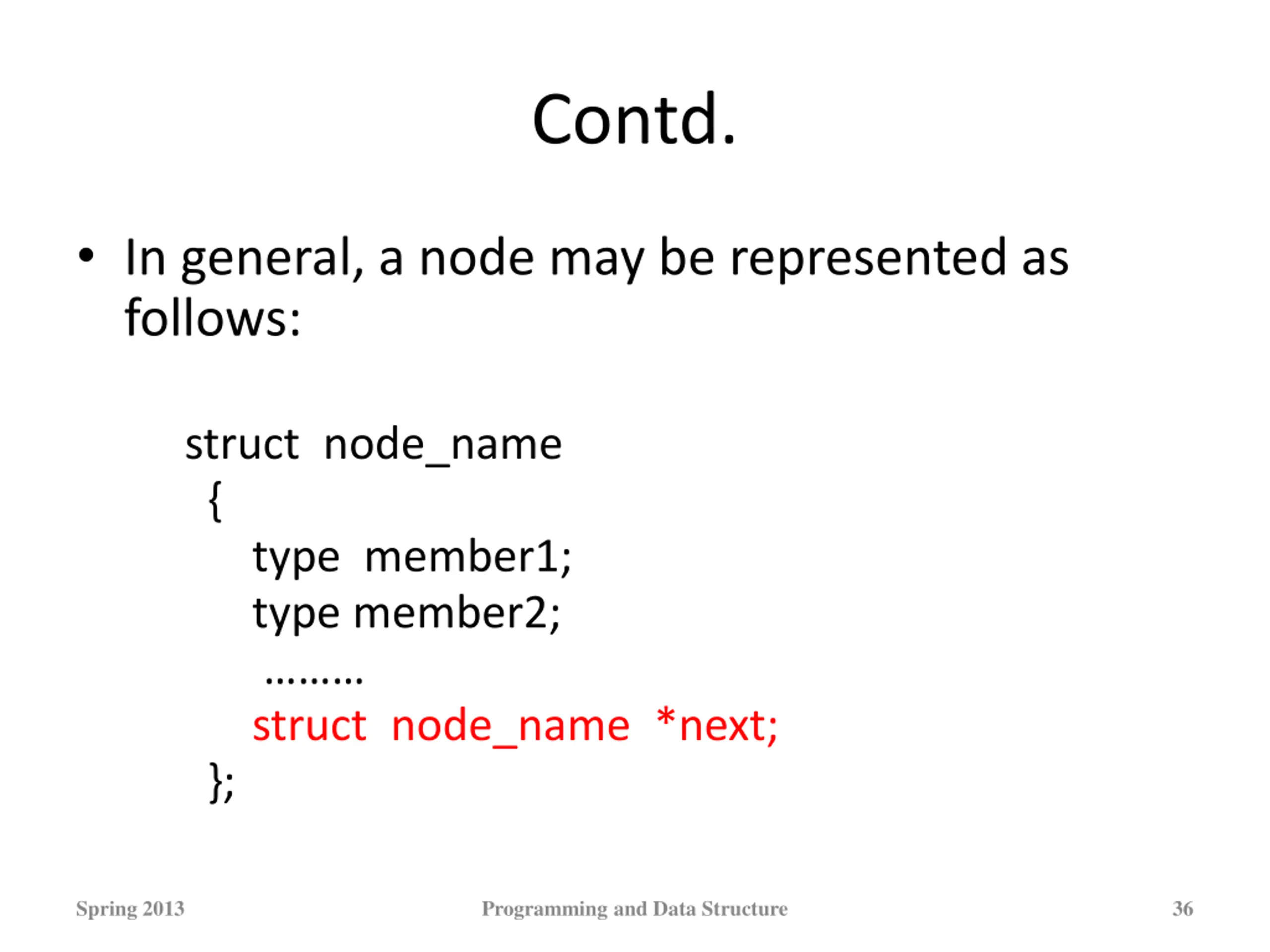 Contd. In general, a node may be represented as follows: struct node_name { type member1; type member2; struct node_name *next; }; Spring 2013 Programming and Data Structure 36