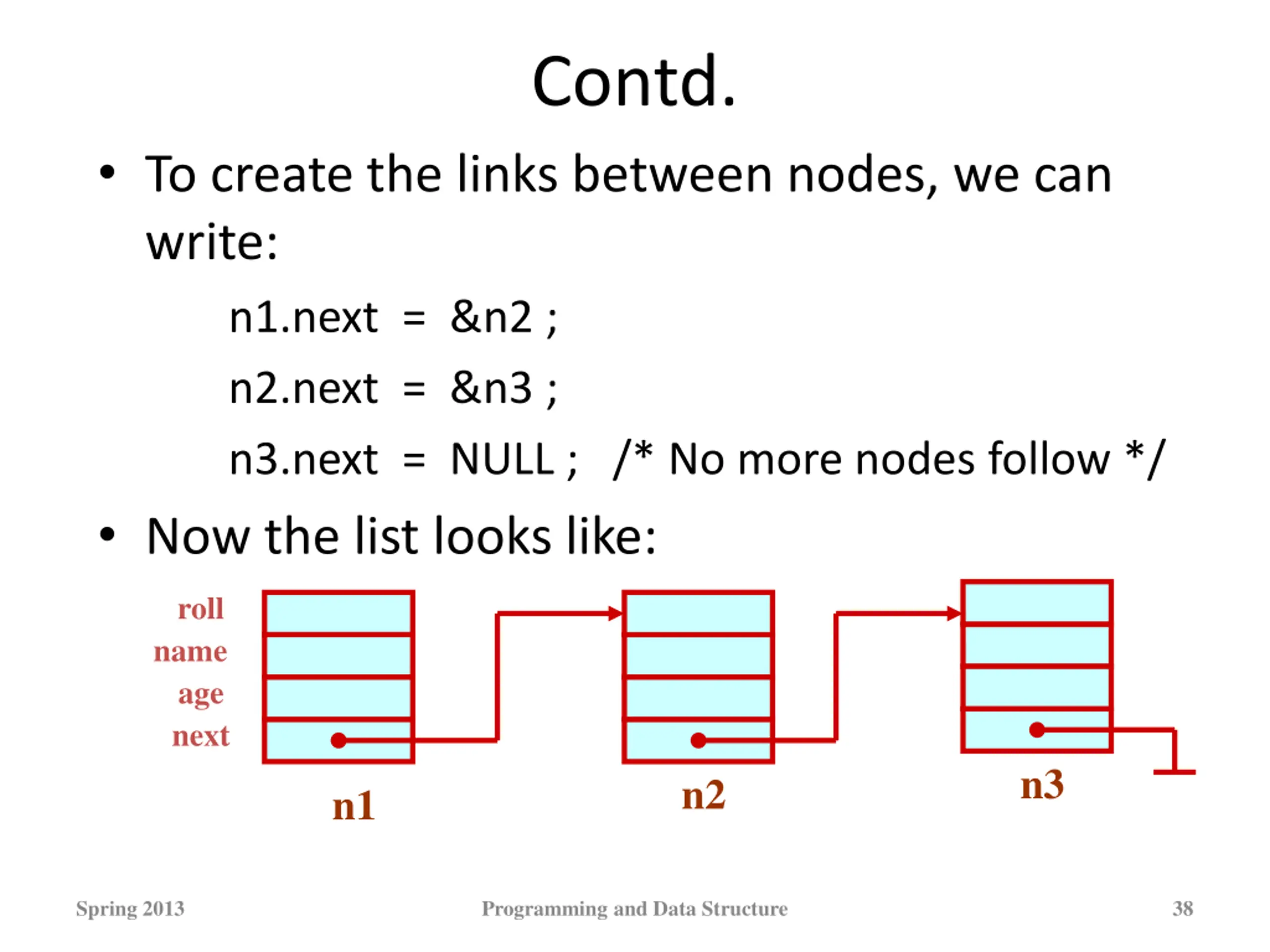 Contd. To create the links between nodes, we can write: n1.next = &n2 ; n2.next = &n3 ; n3.next = NULL ; /* No more nodes follow */ Now the list looks like: roll name age next n3 n2 n1 Spring 2013 Programming and Data Structure 38