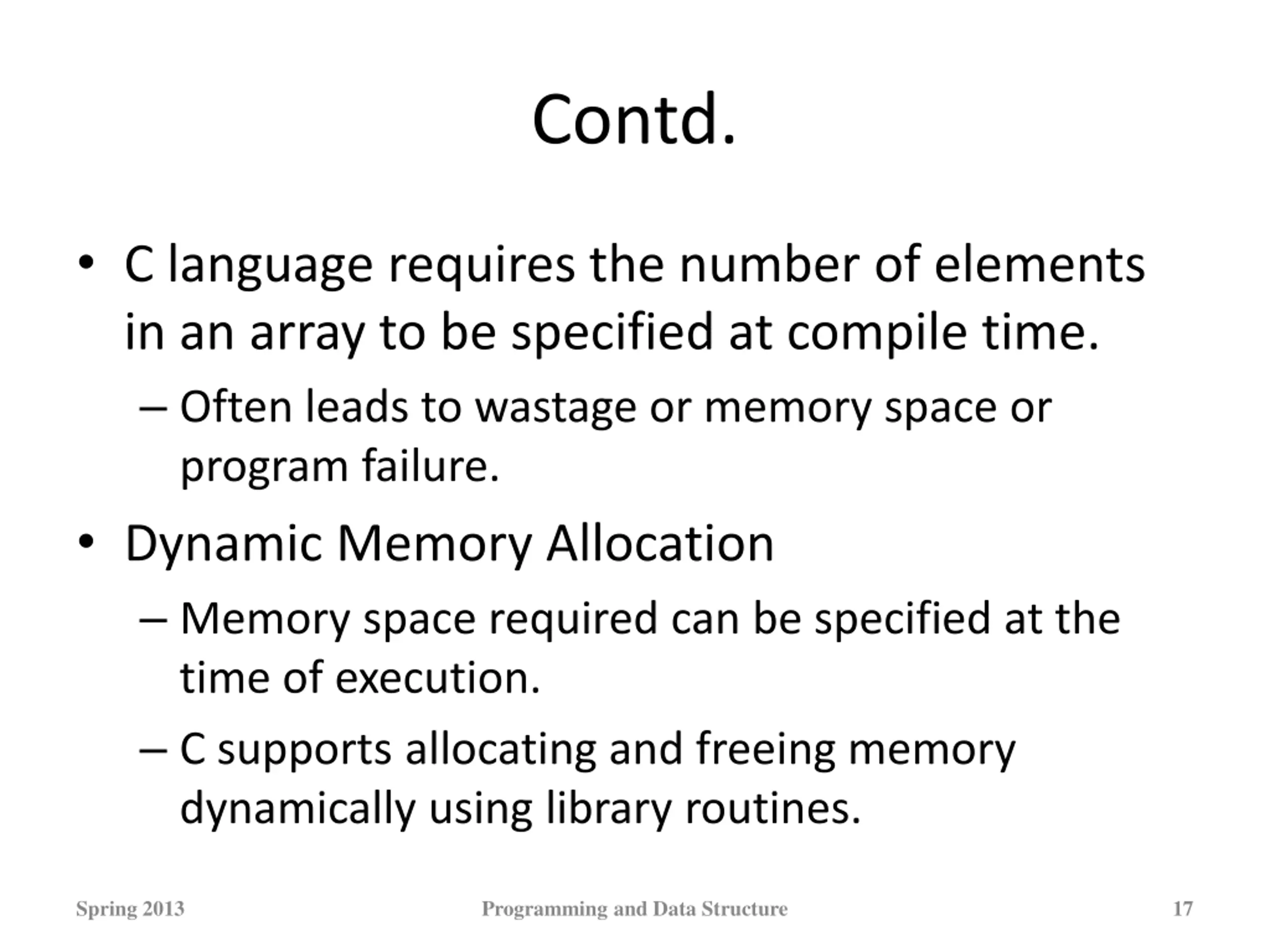 Contd. C language requires the number of elements in an array to be specified at compile time. Often leads to wastage or memory space or program failure. Dynamic Memory Allocation Memory space required can be specified at the time of execution. C supports allocating and freeing memory dynamically using library routines. Spring 2013 Programming and Data Structure 17