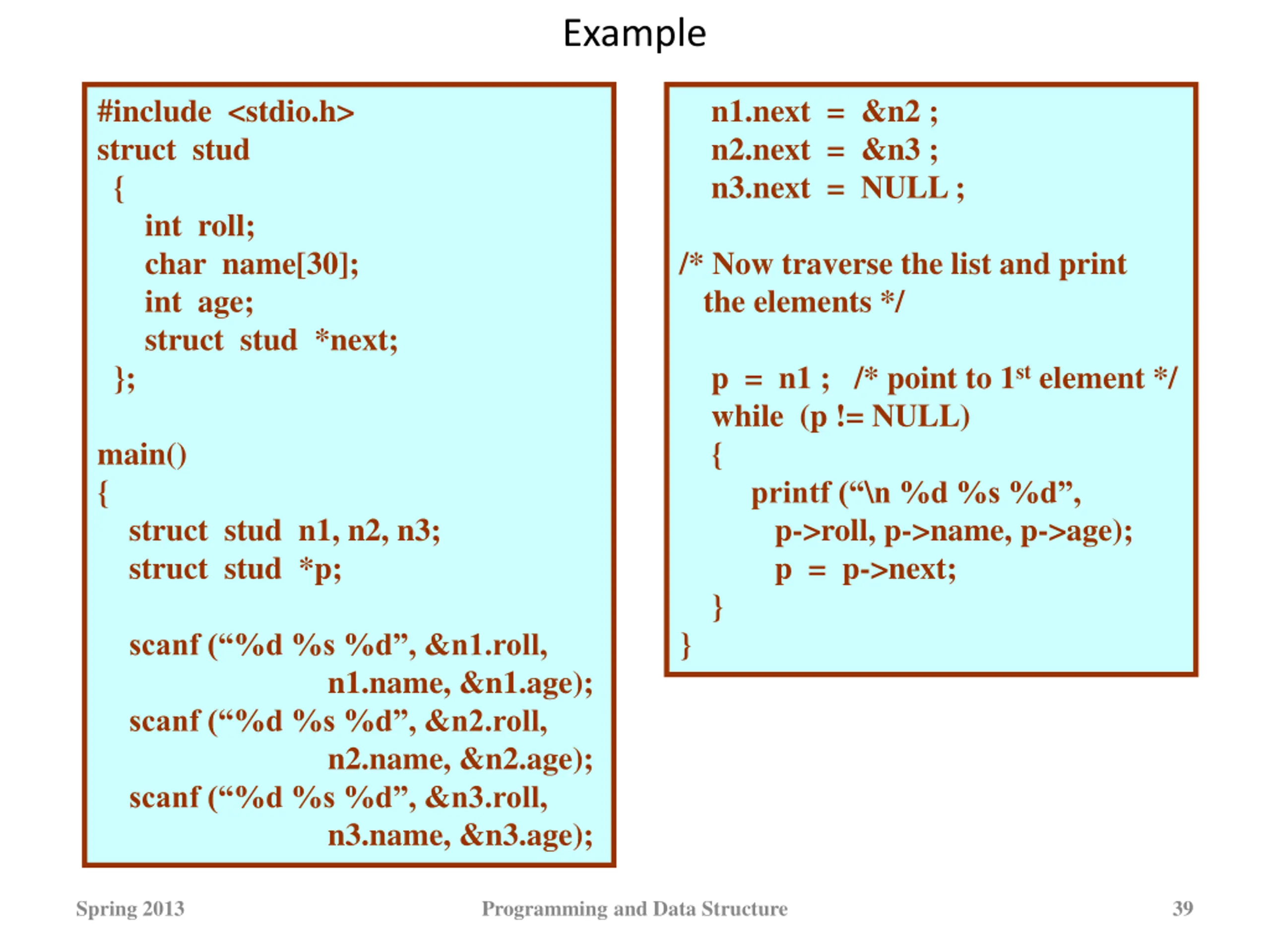 Example #include <stdio.h> struct stud { int roll; char name[30]; int age; struct stud *next; }; n1.next = &n2 ; n2.next = &n3 ; n3.next = NULL ; /* Now traverse the list and print the elements */ p = n1 ; /* point to 1st element */ while (p != NULL) { printf ( \n %d %s %d , p->roll, p->name, p->age); p = p->next; } } main() { struct stud n1, n2, n3; struct stud *p; scanf ( %d %s %d , &n1.roll, n1.name, &n1.age); scanf ( %d %s %d , &n2.roll, n2.name, &n2.age); scanf ( %d %s %d , &n3.roll, n3.name, &n3.age); Spring 2013 Programming and Data Structure 39