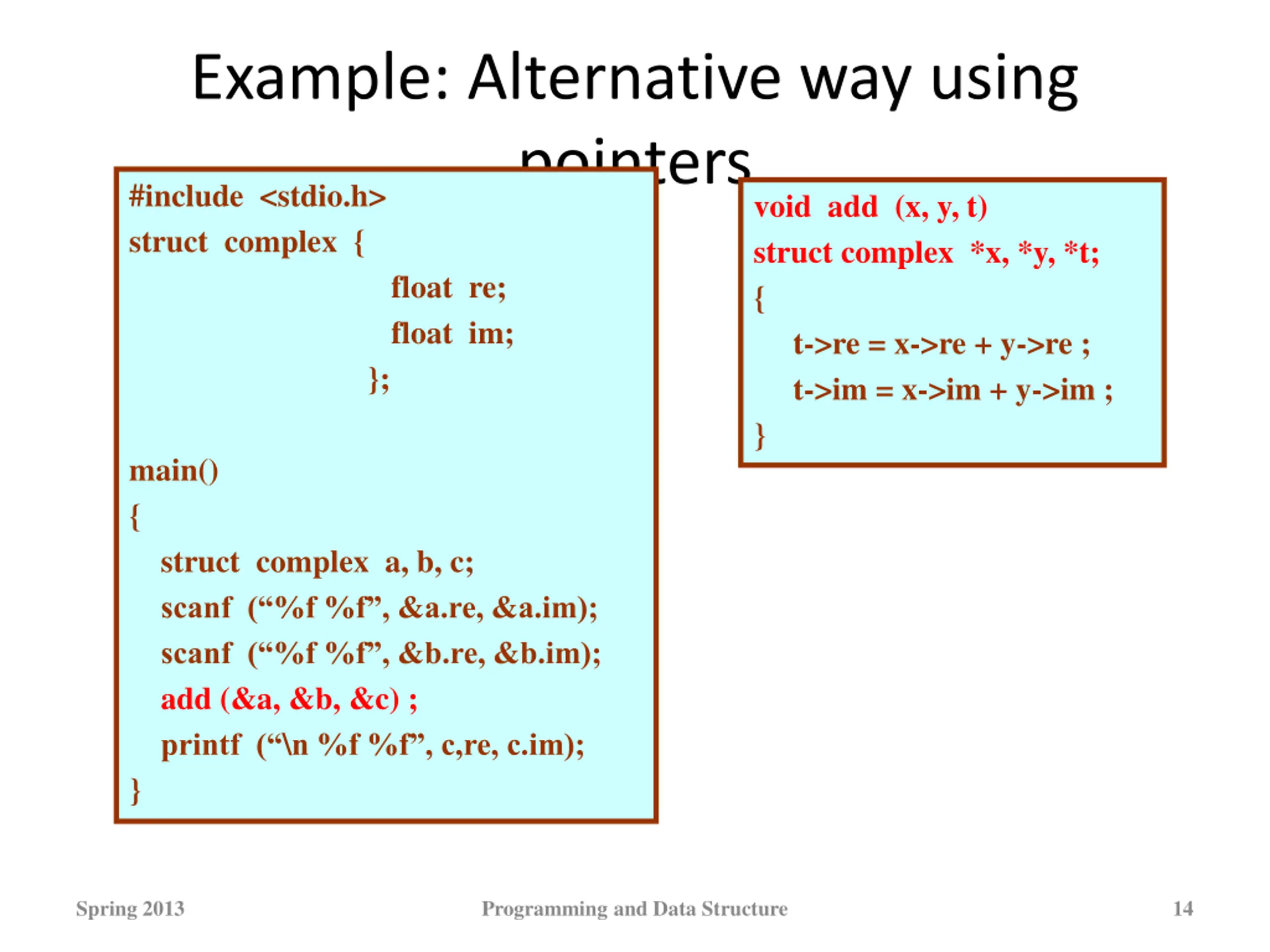 Example: complex number addition #include <stdio.h> struct complex { float re; float im; }; struct complex add (x, y) struct complex x, y; { struct complex t; t.re = x.re + y.re ; t.im = x.im + y.im ; return (t) ; } main() { struct complex a, b, c; scanf ( %f %f , &a.re, &a.im); scanf ( %f %f , &b.re, &b.im); c = add (a, b) ; printf ( \n %f %f , c.re, c.im); } Spring 2013 Programming and Data Structure 13