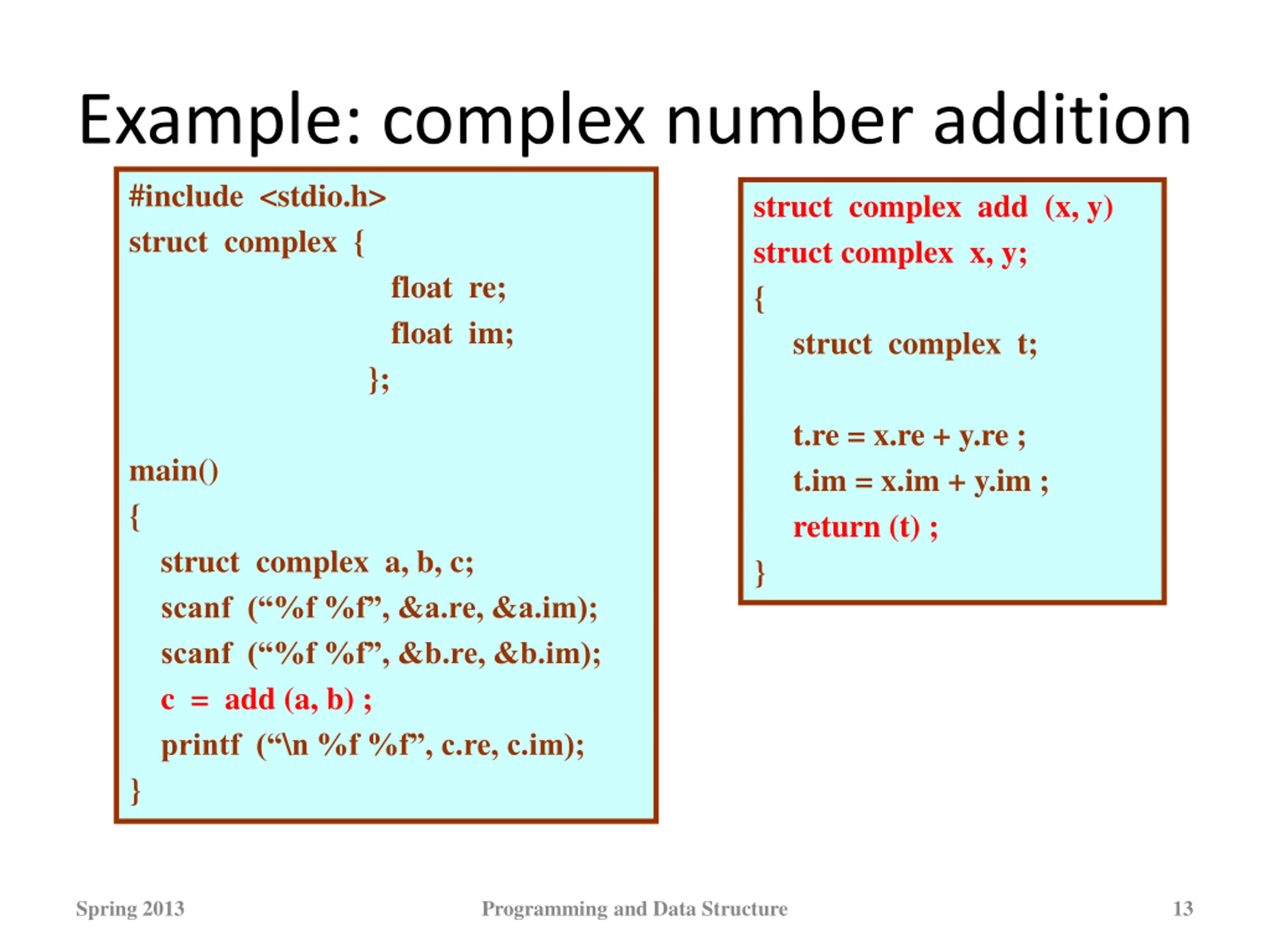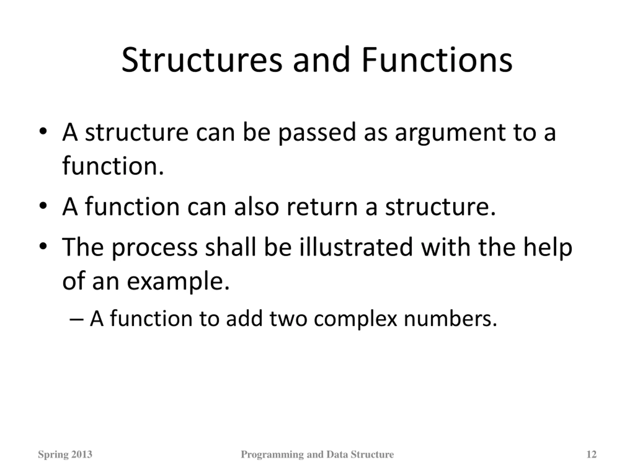 Structures and Functions A structure can be passed as argument to a function. A function can also return a structure. The process shall be illustrated with the help of an example. A function to add two complex numbers. Spring 2013 Programming and Data Structure 12