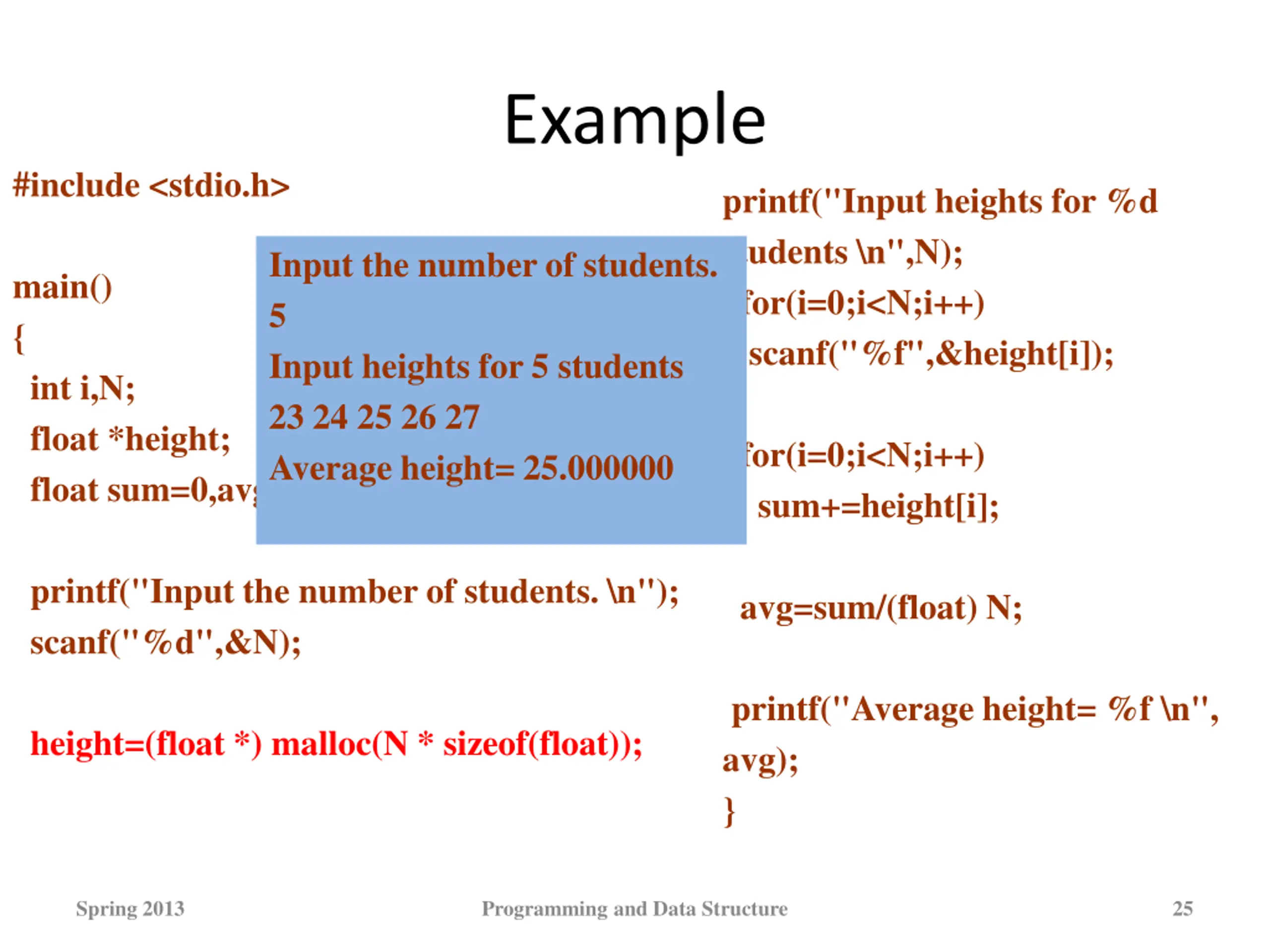 Example #include <stdio.h> printf("Input heights for %d students \n",N); for(i=0;i<N;i++) scanf("%f",&height[i]); Input the number of students. 5 Input heights for 5 students 23 24 25 26 27 Average height= 25.000000 main() { int i,N; float *height; float sum=0,avg; for(i=0;i<N;i++) sum+=height[i]; printf("Input the number of students. \n"); scanf("%d",&N); avg=sum/(float) N; printf("Average height= %f \n", avg); } height=(float *) malloc(N * sizeof(float)); Spring 2013 Programming and Data Structure 25