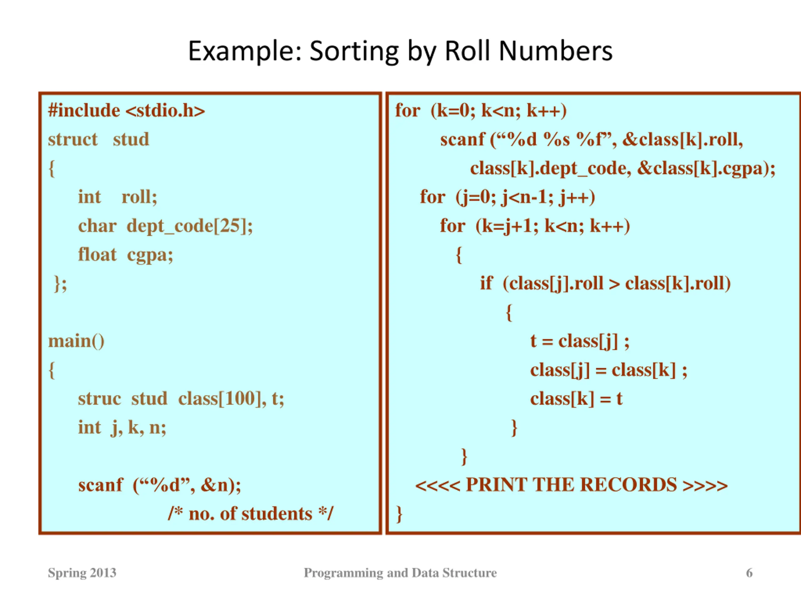Example: Sorting by Roll Numbers #include <stdio.h> struct stud { int roll; char dept_code[25]; float cgpa; }; for (k=0; k<n; k++) scanf ( %d %s %f , &class[k].roll, class[k].dept_code, &class[k].cgpa); for (j=0; j<n-1; j++) for (k=j+1; k<n; k++) { if (class[j].roll > class[k].roll) { t = class[j] ; class[j] = class[k] ; class[k] = t } } <<<< PRINT THE RECORDS >>>> } main() { struc stud class[100], t; int j, k, n; scanf ( %d , &n); /* no. of students */ Spring 2013 Programming and Data Structure 6