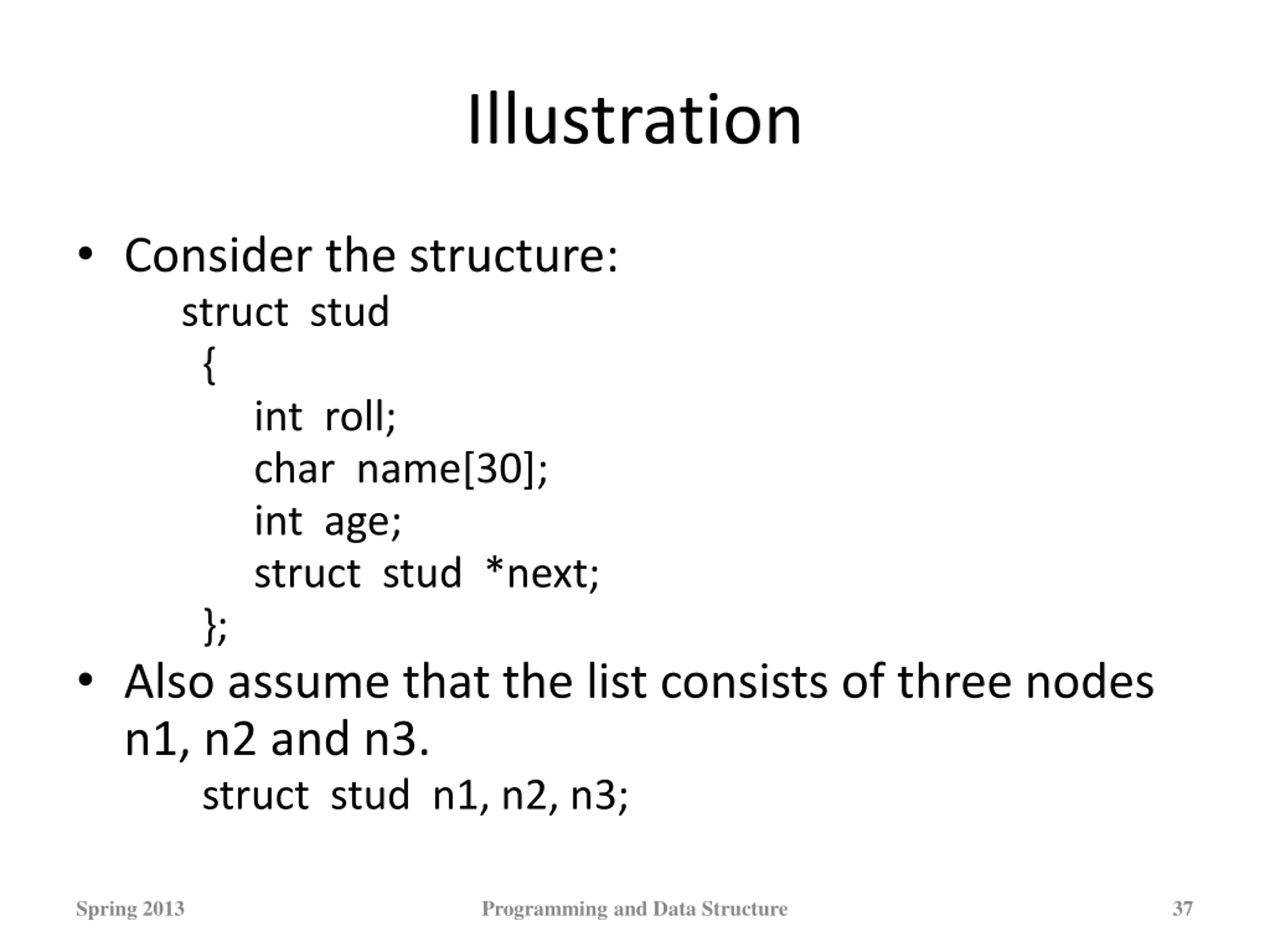 Illustration Consider the structure: struct stud { int roll; char name[30]; int age; struct stud *next; }; Also assume that the list consists of three nodes n1, n2 and n3. struct stud n1, n2, n3; Spring 2013 Programming and Data Structure 37