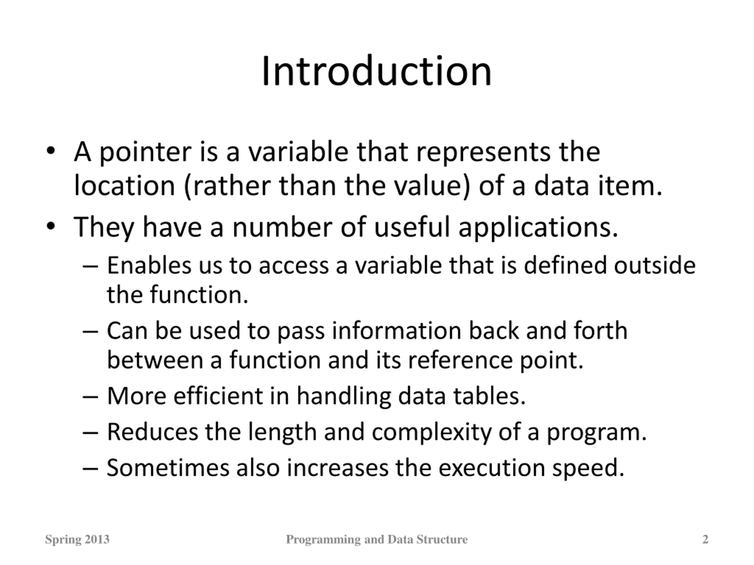 Introduction A pointer is a variable that represents the location (rather than the value) of a data item. They have a number of useful applications. Enables us to access a variable that is defined outside the function. Can be used to pass information back and forth between a function and its reference point. More efficient in handling data tables. Reduces the length and complexity of a program. Sometimes also increases the execution speed. Spring 2013 Programming and Data Structure 2