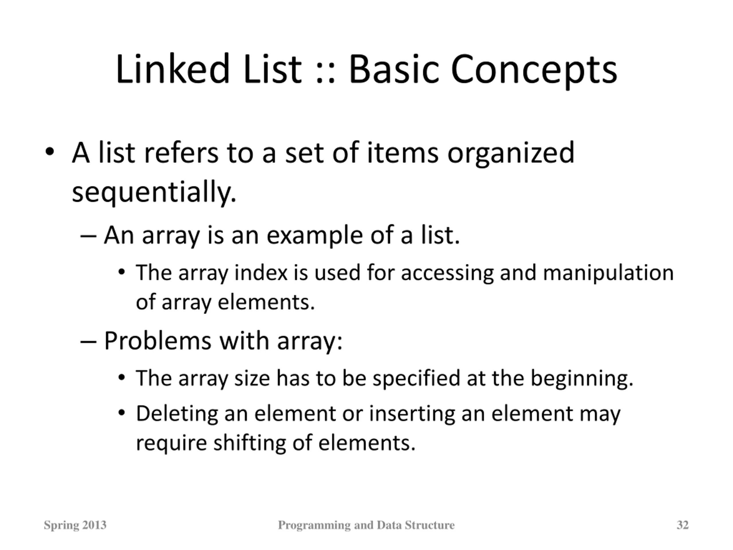Linked List :: Basic Concepts A list refers to a set of items organized sequentially. An array is an example of a list. The array index is used for accessing and manipulation of array elements. Problems with array: The array size has to be specified at the beginning. Deleting an element or inserting an element may require shifting of elements. Spring 2013 Programming and Data Structure 32