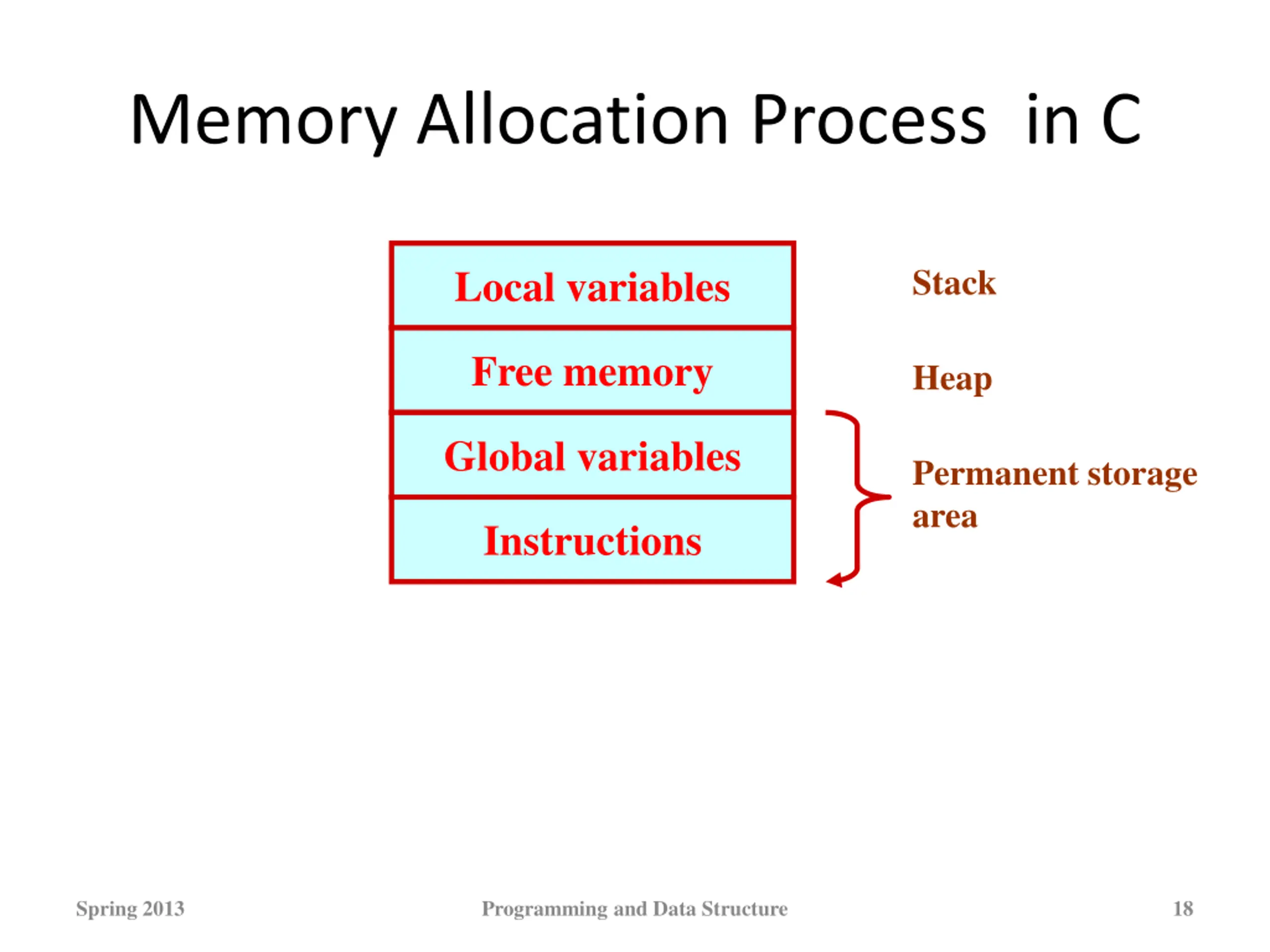Memory Allocation Process in C Stack Local variables Free memory Heap Global variables Permanent storage area Instructions Spring 2013 Programming and Data Structure 18