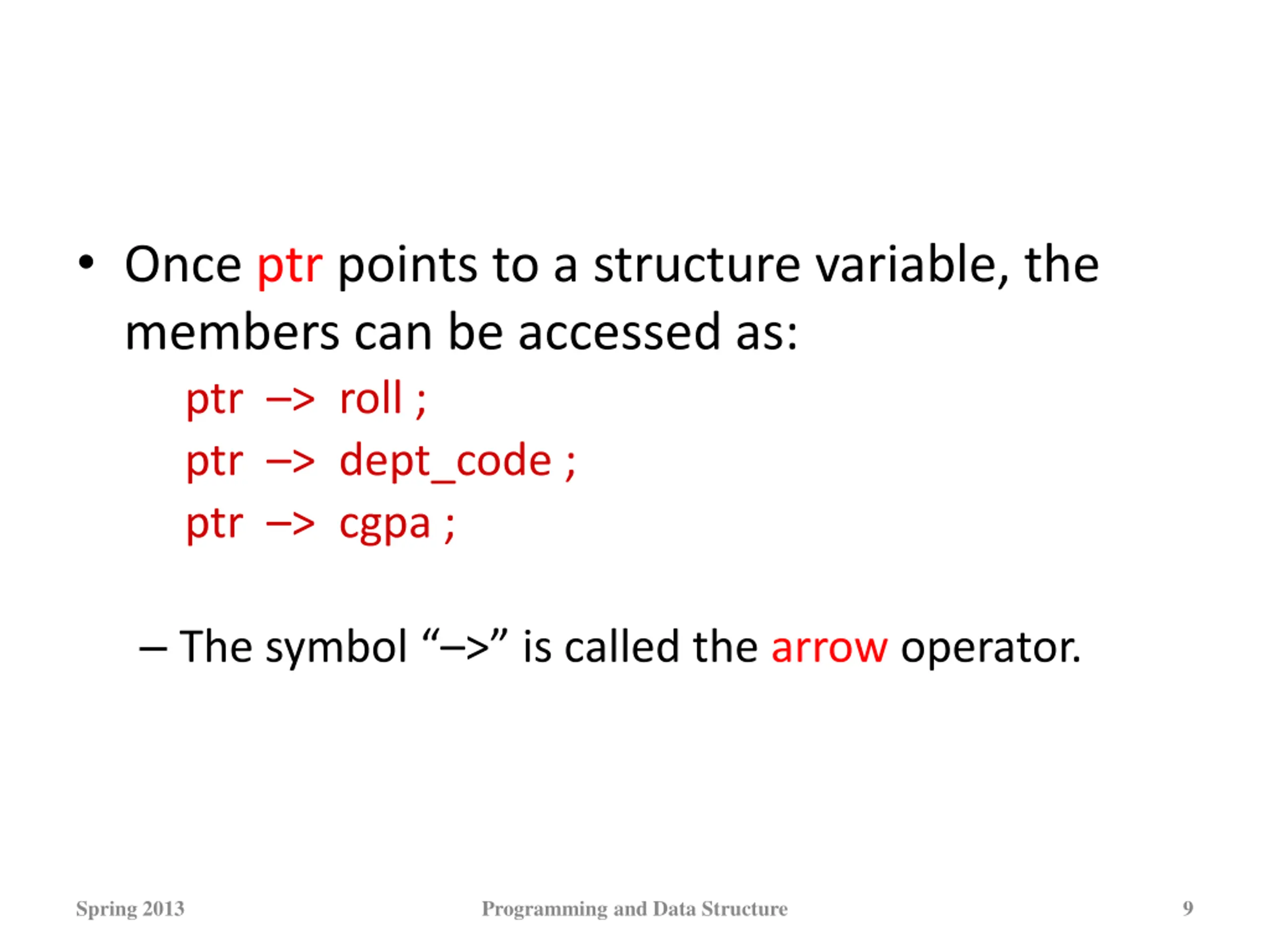 Once ptr points to a structure variable, the members can be accessed as: ptr > roll ; ptr > dept_code ; ptr > cgpa ; The symbol > is called the arrow operator. Spring 2013 Programming and Data Structure 9