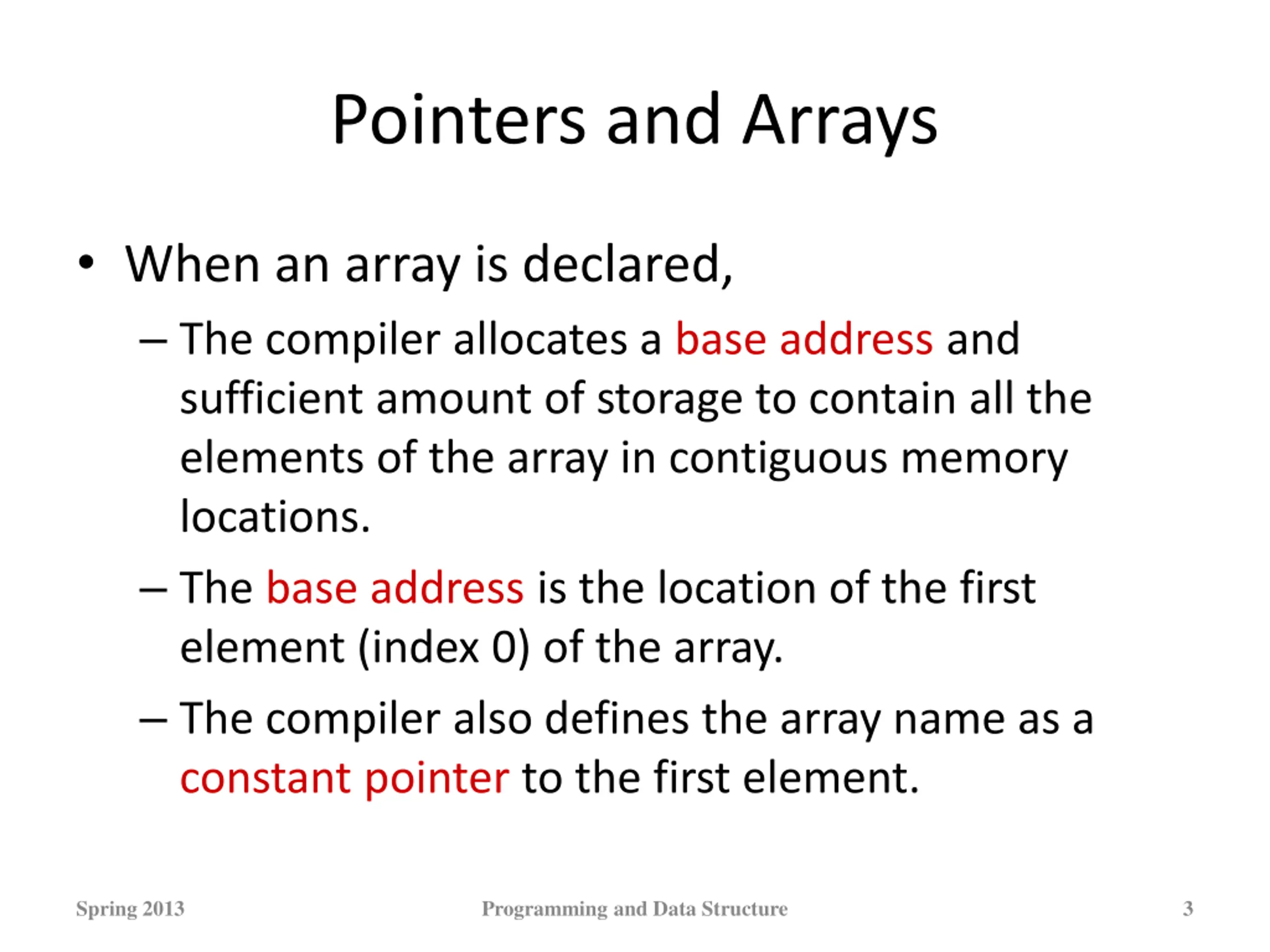 Pointers and Arrays When an array is declared, The compiler allocates a base address and sufficient amount of storage to contain all the elements of the array in contiguous memory locations. The base address is the location of the first element (index 0) of the array. The compiler also defines the array name as a constant pointer to the first element. Spring 2013 Programming and Data Structure 3