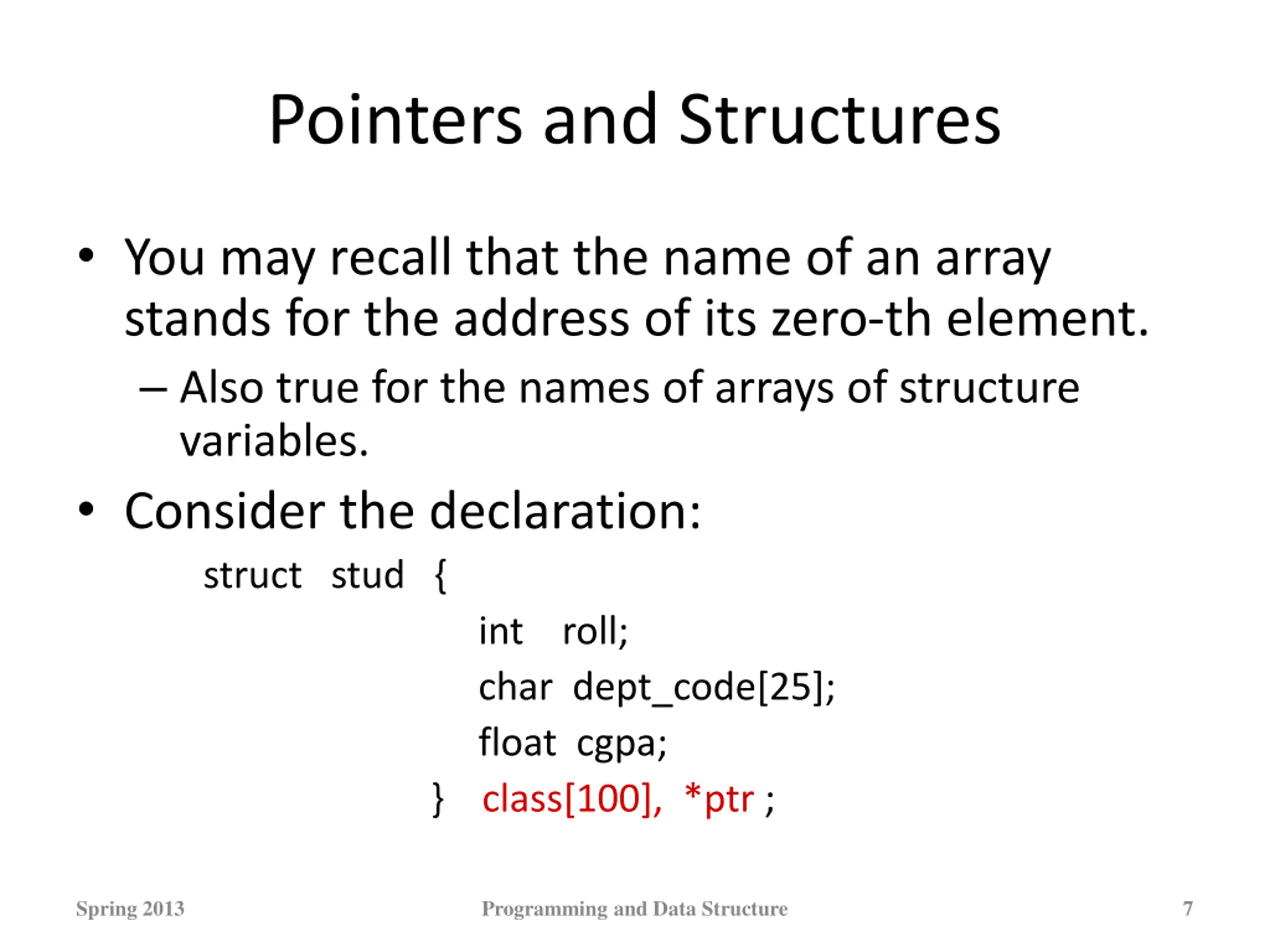 Pointers and Structures You may recall that the name of an array stands for the address of its zero-th element. Also true for the names of arrays of structure variables. Consider the declaration: struct stud { int roll; char dept_code[25]; float cgpa; } class[100], *ptr ; Spring 2013 Programming and Data Structure 7