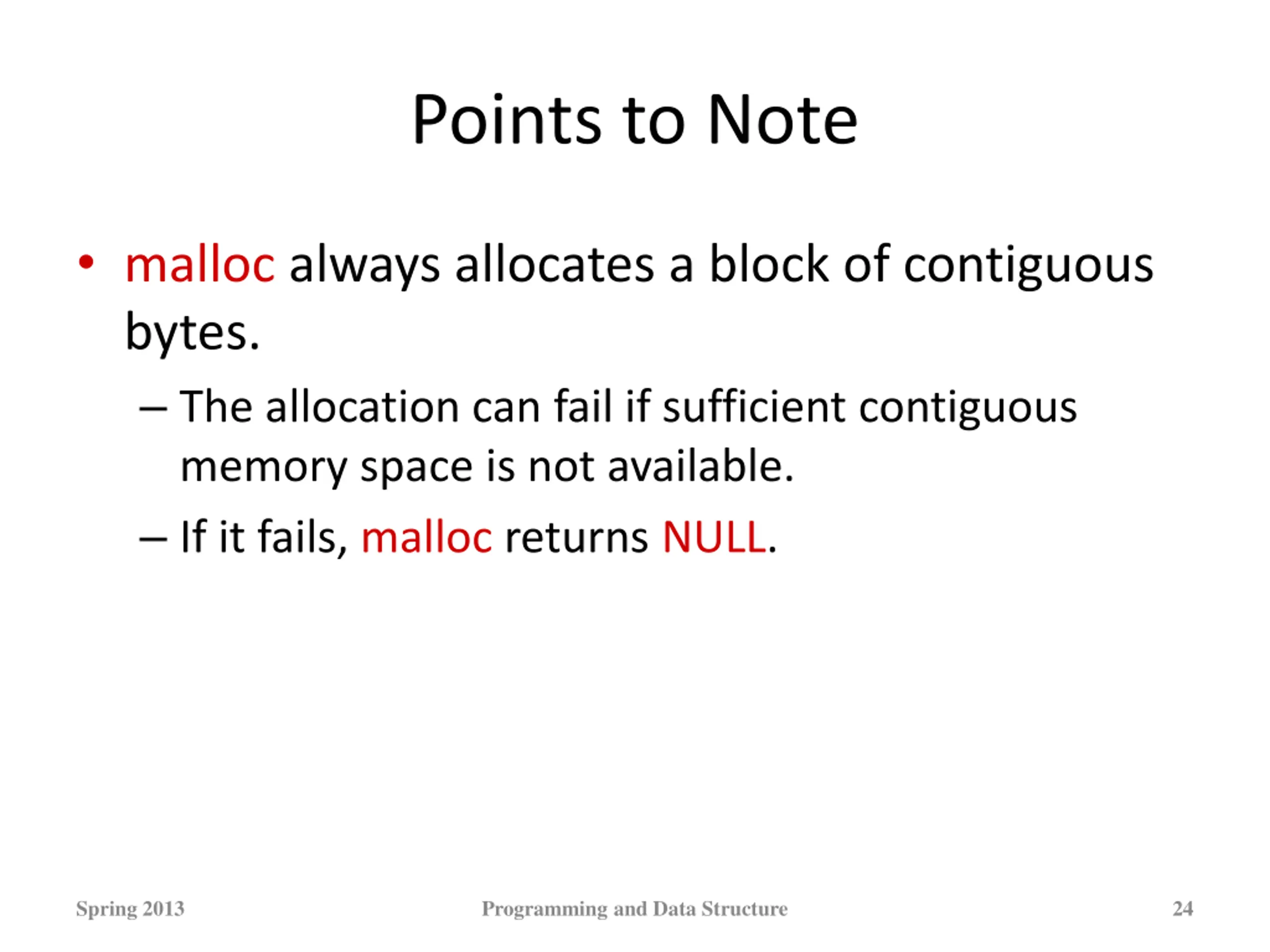 Points to Note malloc always allocates a block of contiguous bytes. The allocation can fail if sufficient contiguous memory space is not available. If it fails, malloc returns NULL. Spring 2013 Programming and Data Structure 24