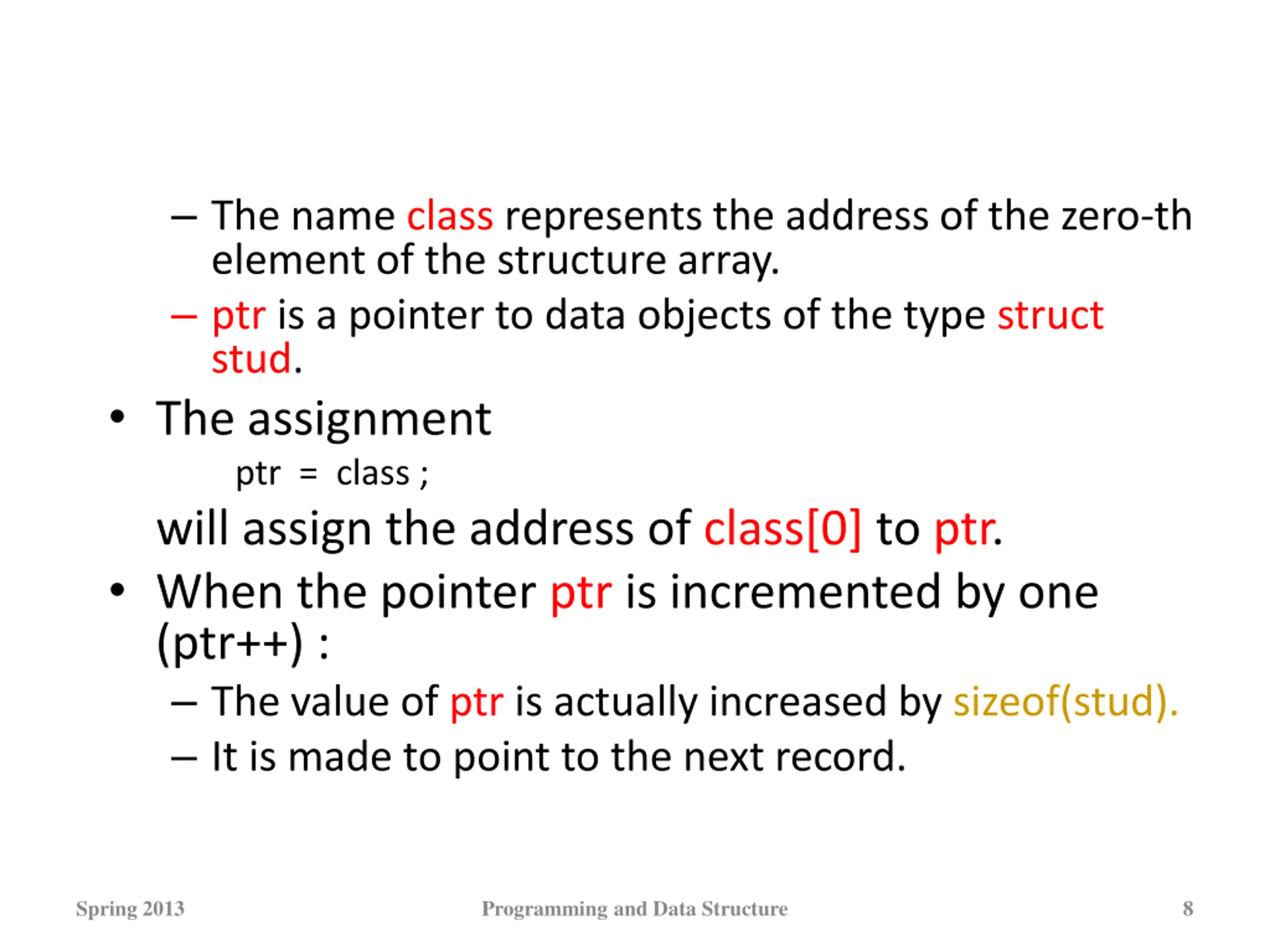 The name class represents the address of the zero-th element of the structure array. ptr is a pointer to data objects of the type struct stud. The assignment ptr = class ; will assign the address of class[0] to ptr. When the pointer ptr is incremented by one (ptr++) : The value of ptr is actually increased by sizeof(stud). It is made to point to the next record. Spring 2013 Programming and Data Structure 8
