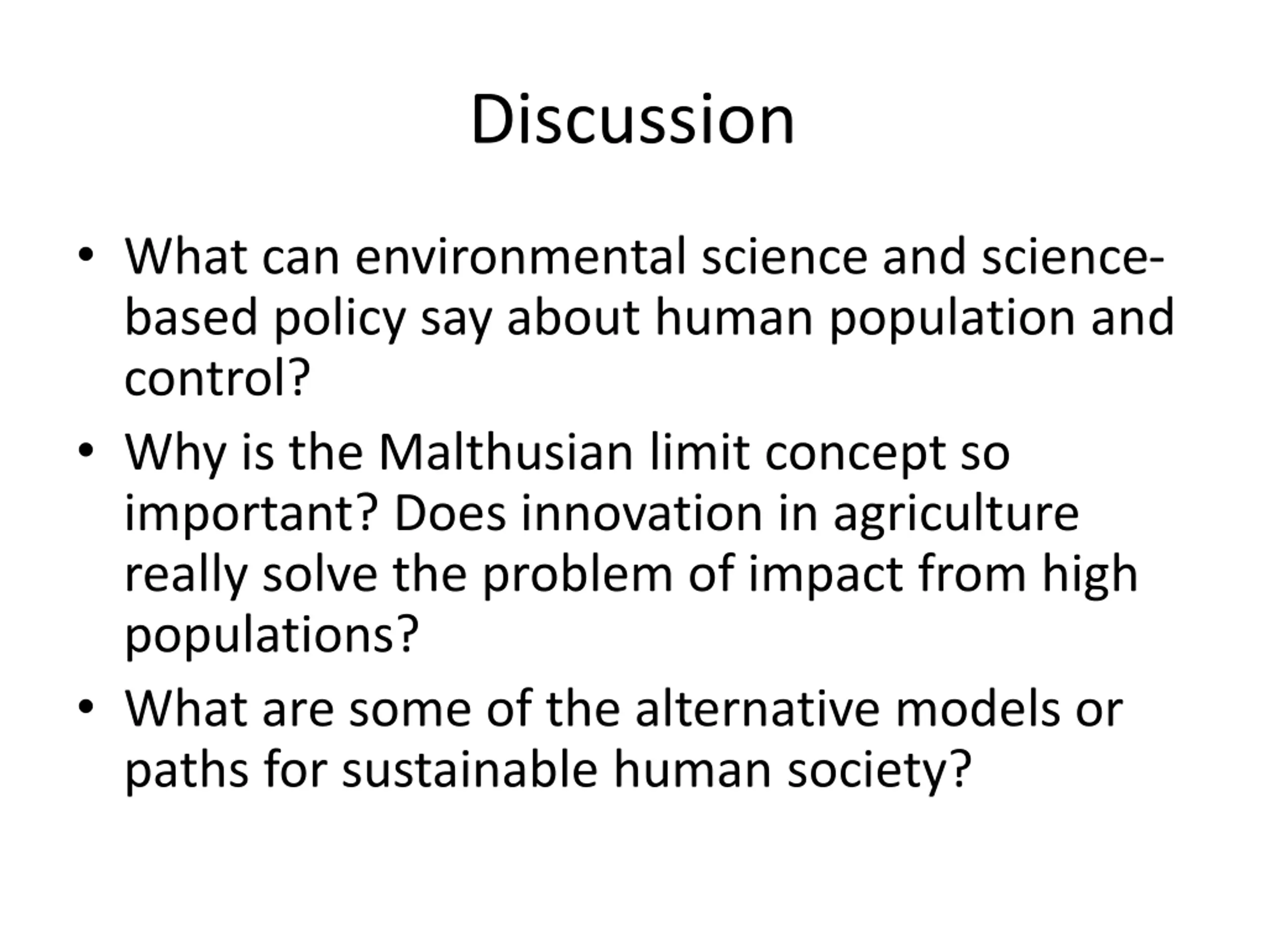 Discussion What can environmental science and science- based policy say about human population and control? Why is the Malthusian limit concept so important? Does innovation in agriculture really solve the problem of impact from high populations? What are some of the alternative models or paths for sustainable human society?
