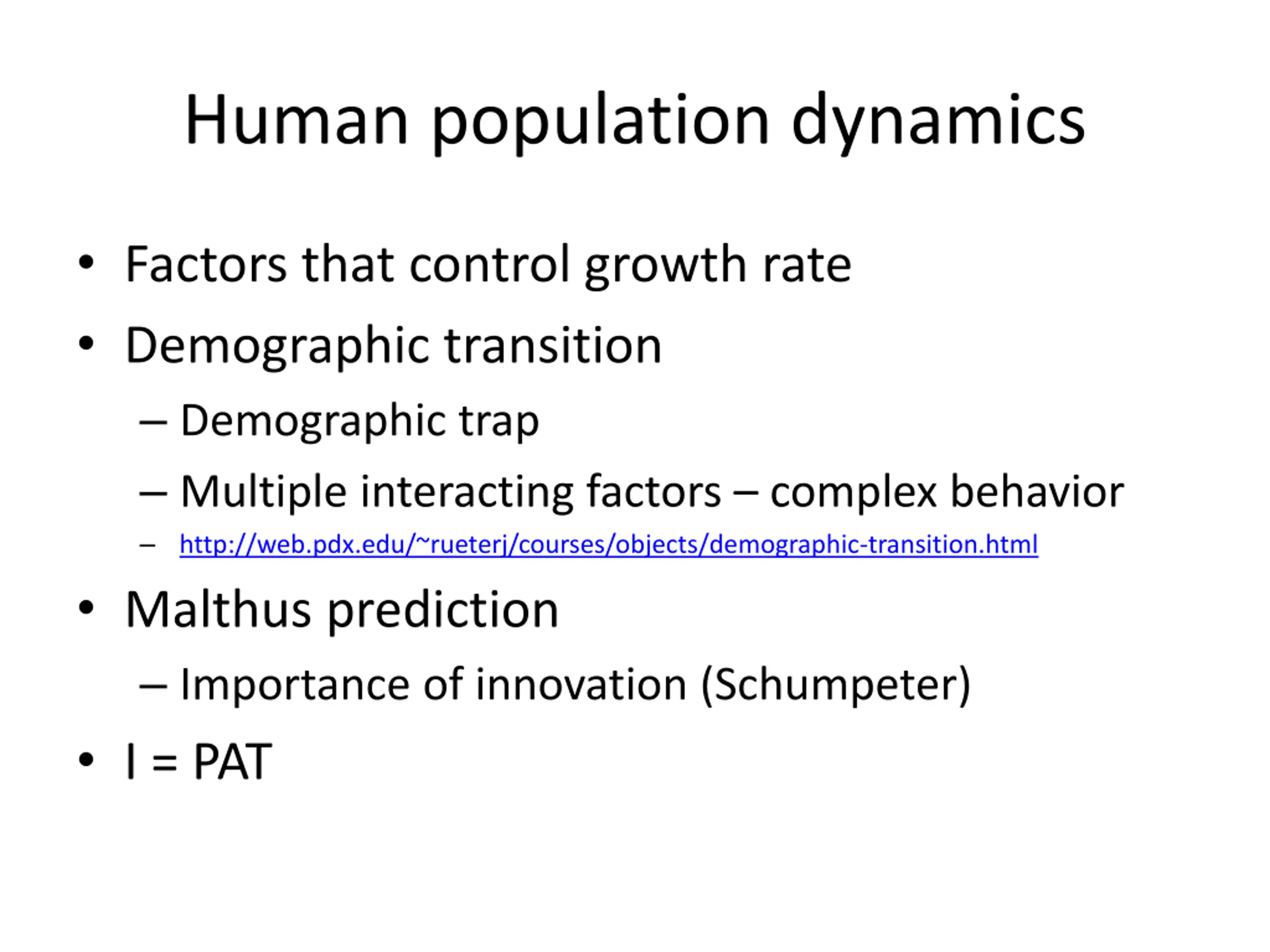 Human population dynamics Factors that control growth rate Demographic transition Demographic trap Multiple interacting factors complex behavior http://web.pdx.edu/~rueterj/courses/objects/demographic-transition.html Malthus prediction Importance of innovation (Schumpeter) I = PAT