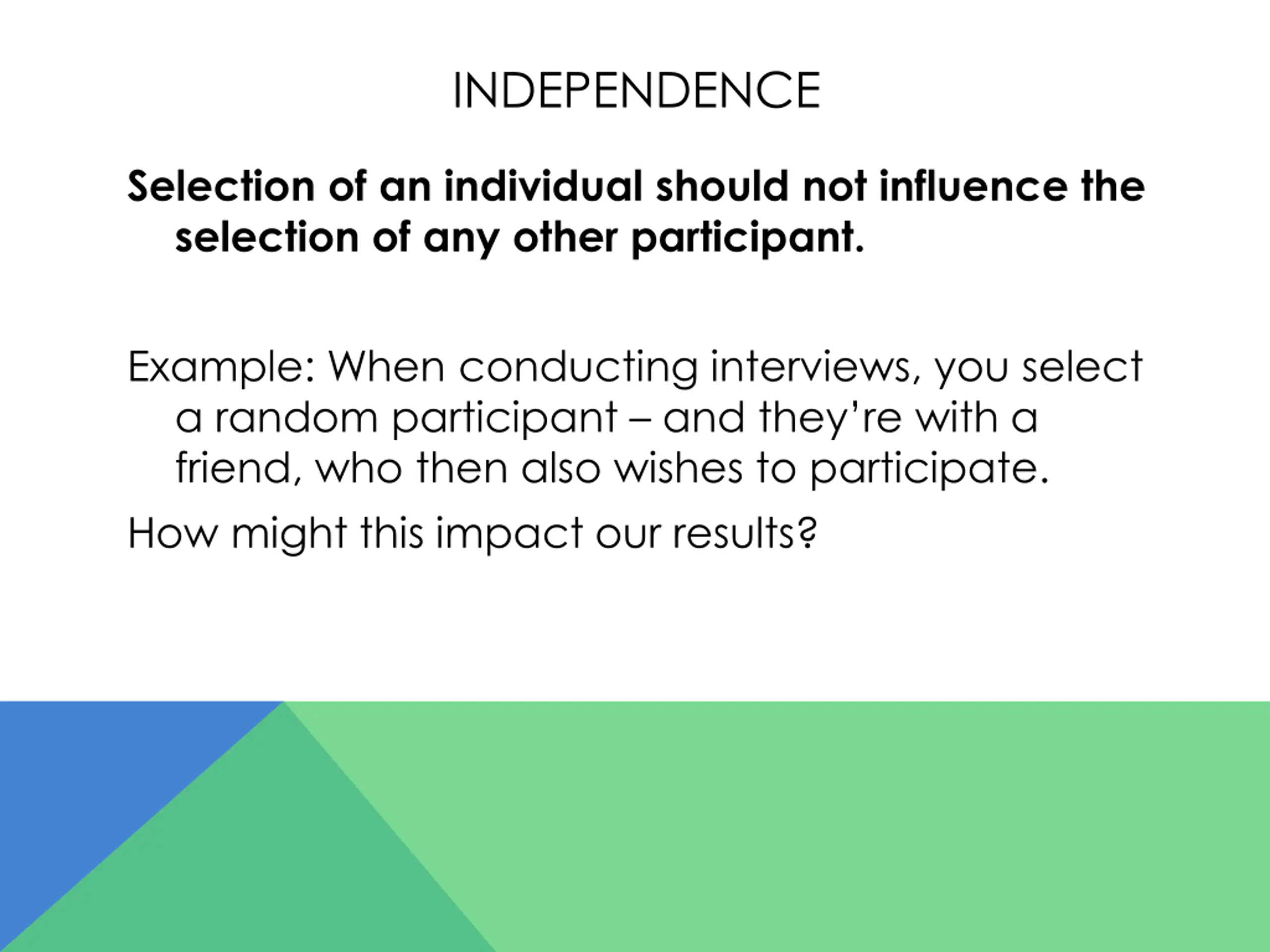 INDEPENDENCE Selection of an individual should not influence the selection of any other participant. Example: When conducting interviews, you select a random participant and they re with a friend, who then also wishes to participate. How might this impact our results?