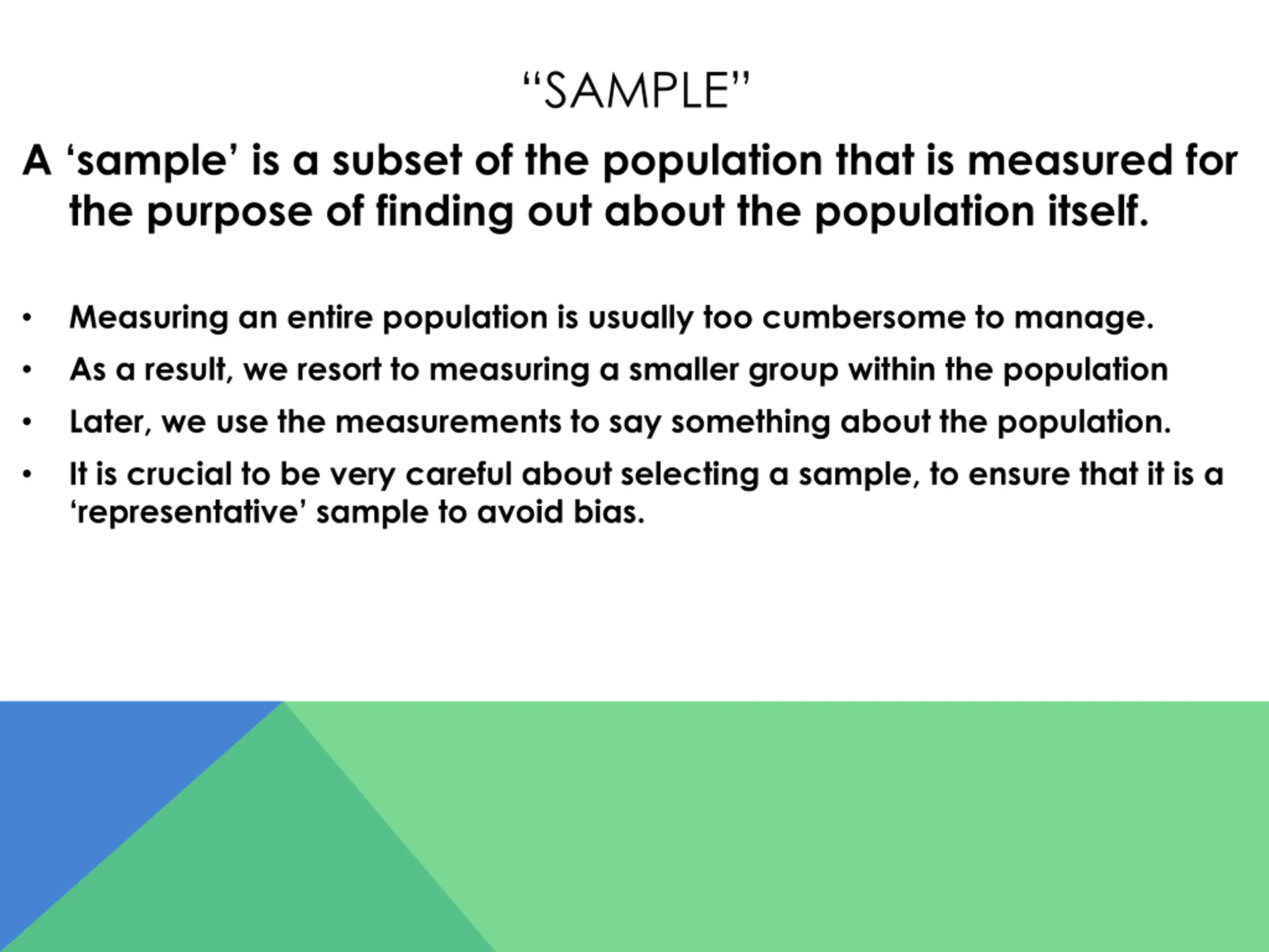 SAMPLE A sample is a subset of the population that is measured for the purpose of finding out about the population itself. Measuring an entire population is usually too cumbersome to manage. As a result, we resort to measuring a smaller group within the population Later, we use the measurements to say something about the population. It is crucial to be very careful about selecting a sample, to ensure that it is a representative sample to avoid bias.