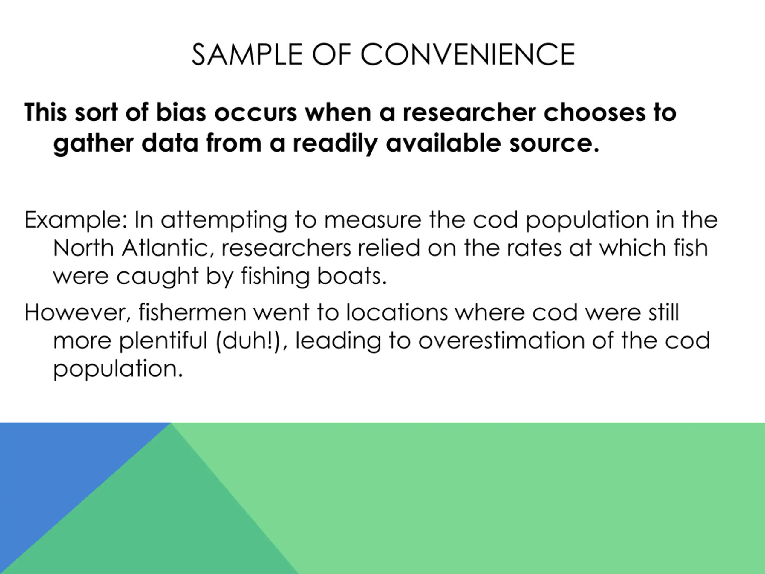 SAMPLE OF CONVENIENCE This sort of bias occurs when a researcher chooses to gather data from a readily available source. Example: In attempting to measure the cod population in the North Atlantic, researchers relied on the rates at which fish were caught by fishing boats. However, fishermen went to locations where cod were still more plentiful (duh!), leading to overestimation of the cod population.