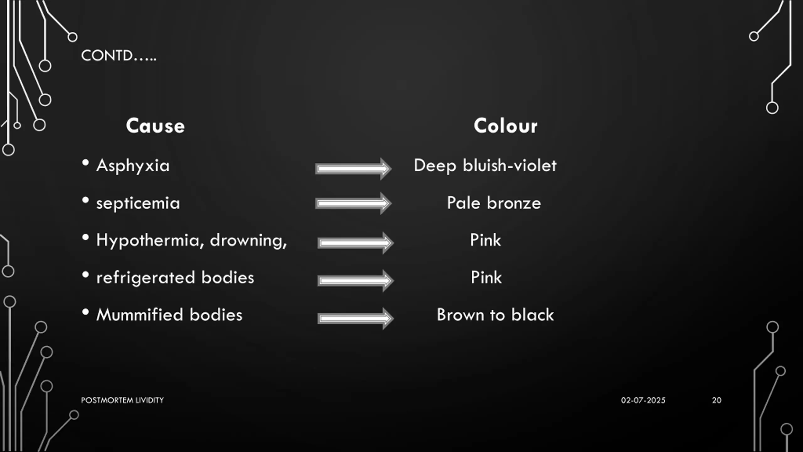 CONTD.. CauseColour Asphyxia Deep bluish-violet septicemia Pale bronze Hypothermia, drowning, Pink refrigerated bodies Pink Mummified bodies Brown to black POSTMORTEM LIVIDITY 02-07-2025 20