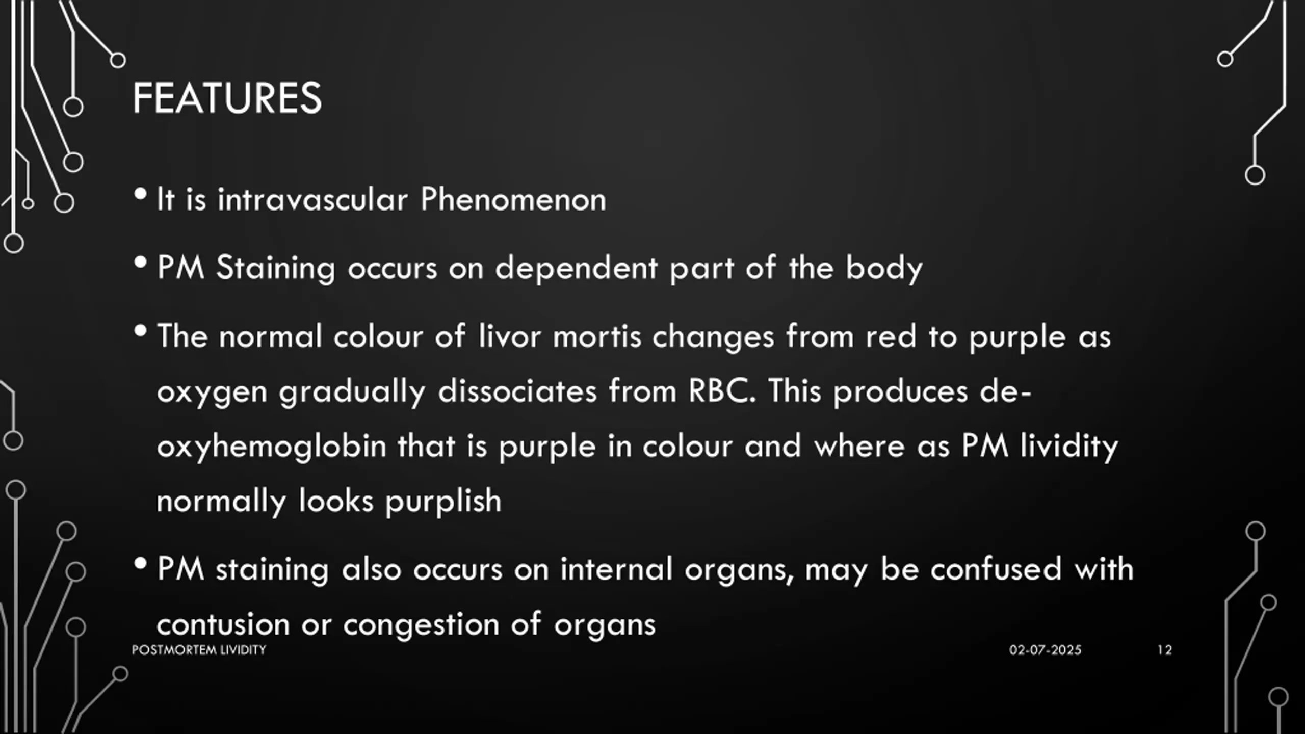 FEATURES It is intravascular Phenomenon PM Staining occurs on dependent part of the body The normal colour of livor mortis changes from red to purple as oxygen gradually dissociates from RBC. This produces de- oxyhemoglobin that is purple in colour and where as PM lividity normally looks purplish PM staining also occurs on internal organs, may be confused with contusion or congestion of organs POSTMORTEM LIVIDITY 02-07-2025 12