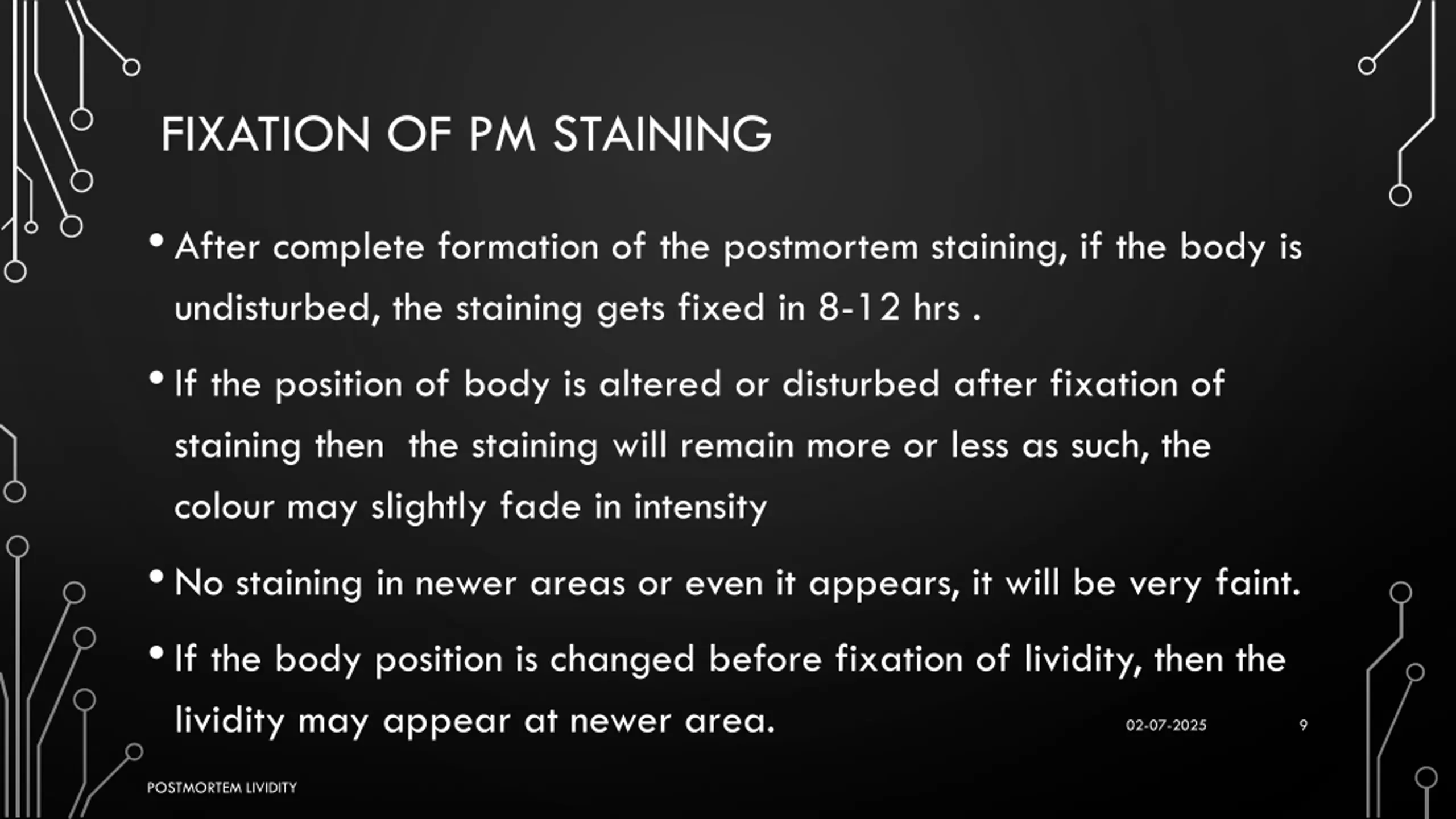 FIXATION OF PM STAINING After complete formation of the postmortem staining, if the body is undisturbed, the staining gets fixed in 8-12 hrs . If the position of body is altered or disturbed after fixation of staining then the staining will remain more or less as such, the colour may slightly fade in intensity No staining in newer areas or even it appears, it will be very faint. If the body position is changed before fixation of lividity, then the lividity may appear at newer area. 02-07-2025 9 POSTMORTEM LIVIDITY
