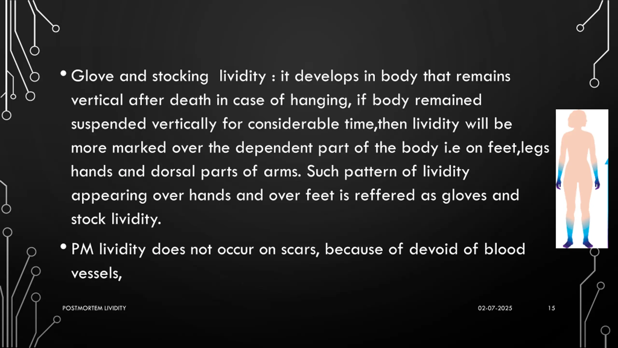 Glove and stocking lividity : it develops in body that remains vertical after death in case of hanging, if body remained suspended vertically for considerable time,then lividity will be more marked over the dependent part of the body i.e on feet,legs hands and dorsal parts of arms. Such pattern of lividity appearing over hands and over feet is reffered as gloves and stock lividity. PM lividity does not occur on scars, because of devoid of blood vessels, POSTMORTEM LIVIDITY 02-07-2025 15