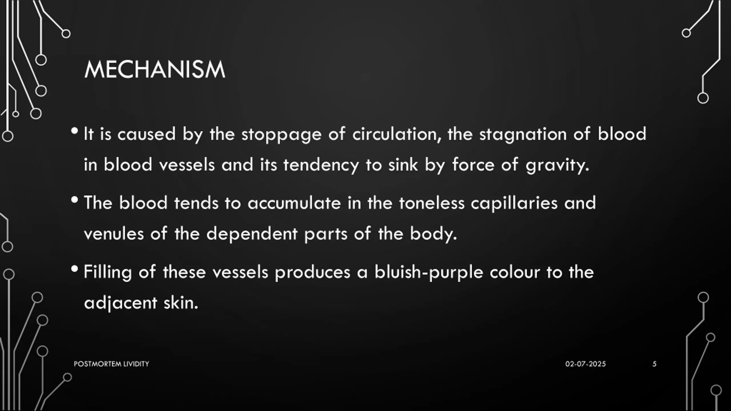MECHANISM It is caused by the stoppage of circulation, the stagnation of blood in blood vessels and its tendency to sink by force of gravity. The blood tends to accumulate in the toneless capillaries and venules of the dependent parts of the body. Filling of these vessels produces a bluish-purple colour to the adjacent skin. POSTMORTEM LIVIDITY 02-07-2025 5