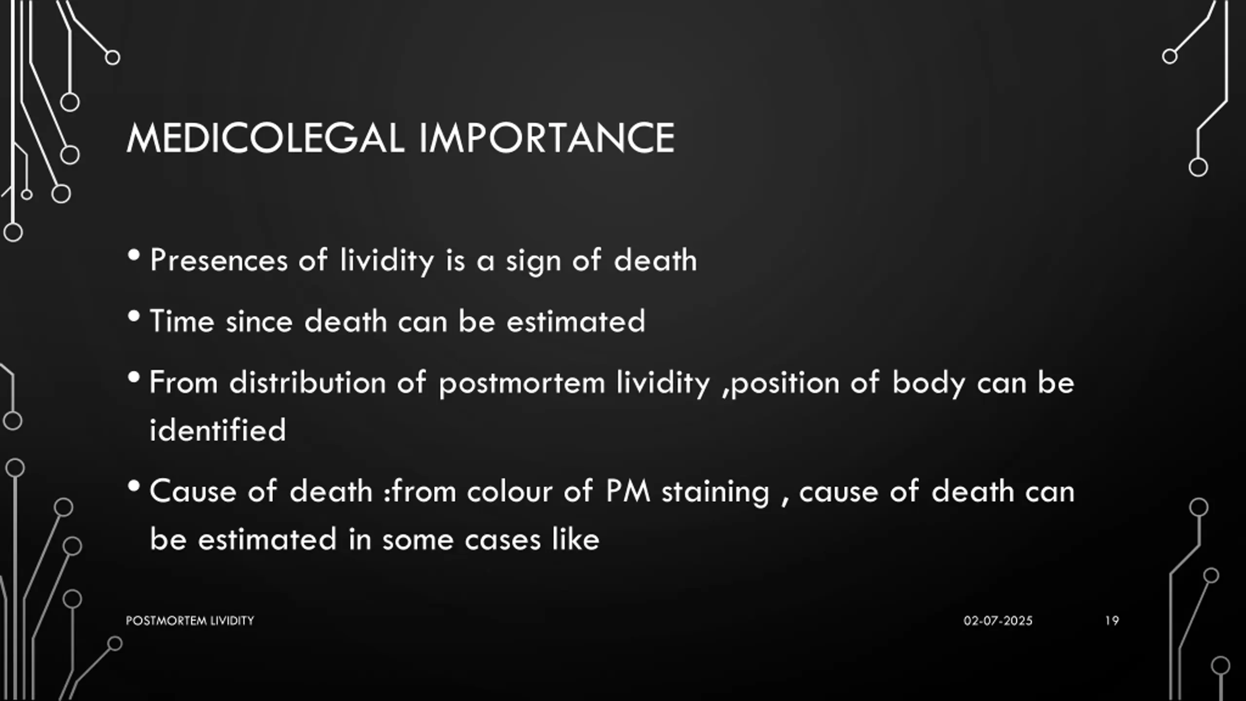 MEDICOLEGAL IMPORTANCE Presences of lividity is a sign of death Time since death can be estimated From distribution of postmortem lividity ,position of body can be identified Cause of death :from colour of PM staining , cause of death can be estimated in some cases like POSTMORTEM LIVIDITY 02-07-2025 19