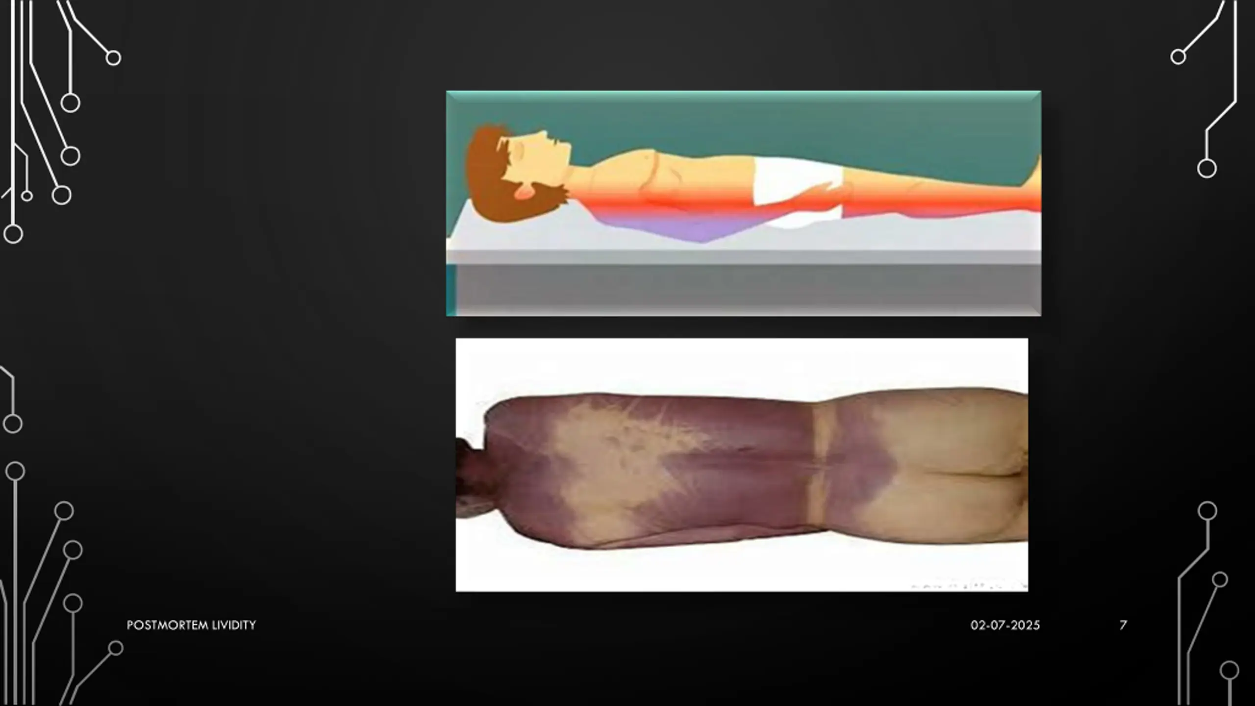 Postmortem lividity Dependent part Appears in patches Patches merges to form uniform staining area Lividity not fixed Lividity fixed POSTMORTEM LIVIDITY 02-07-2025 10