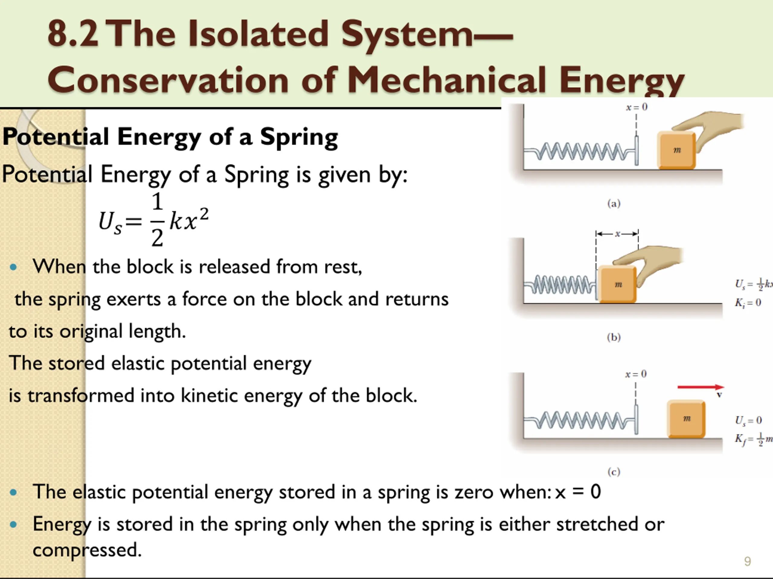 8.2 The Isolated System Conservation of Mechanical Energy Potential Energy of a Spring Potential Energy of a Spring is given by: ??=1 2??2 When the block is released from rest, the spring exerts a force on the block and returns to its original length. The stored elastic potential energy is transformed into kinetic energy of the block. The elastic potential energy stored in a spring is zero when: x = 0 Energy is stored in the spring only when the spring is either stretched or compressed. 9