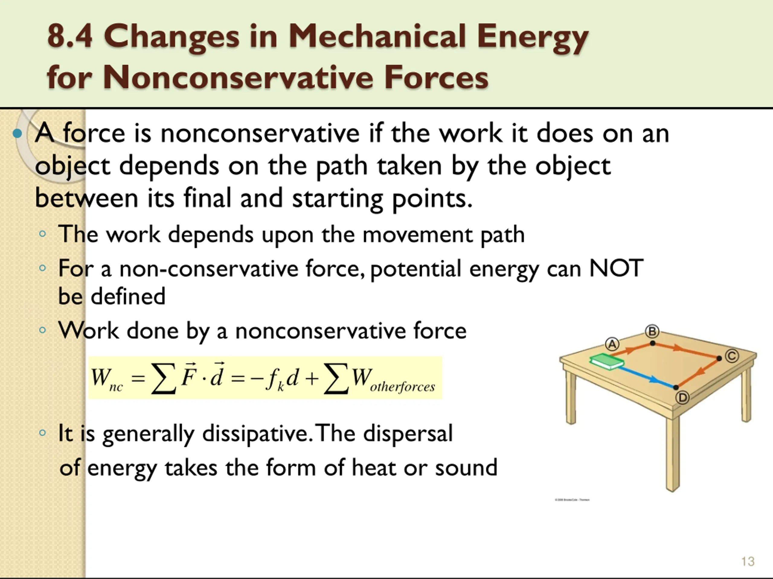 8.4 Changes in Mechanical Energy for Nonconservative Forces A force is nonconservative if the work it does on an object depends on the path taken by the object between its final and starting points. The work depends upon the movement path For a non-conservative force, potential energy can NOT be defined Work done by a nonconservative force k nc d f d F W = = + otherforce W s It is generally dissipative. The dispersal of energy takes the form of heat or sound 13