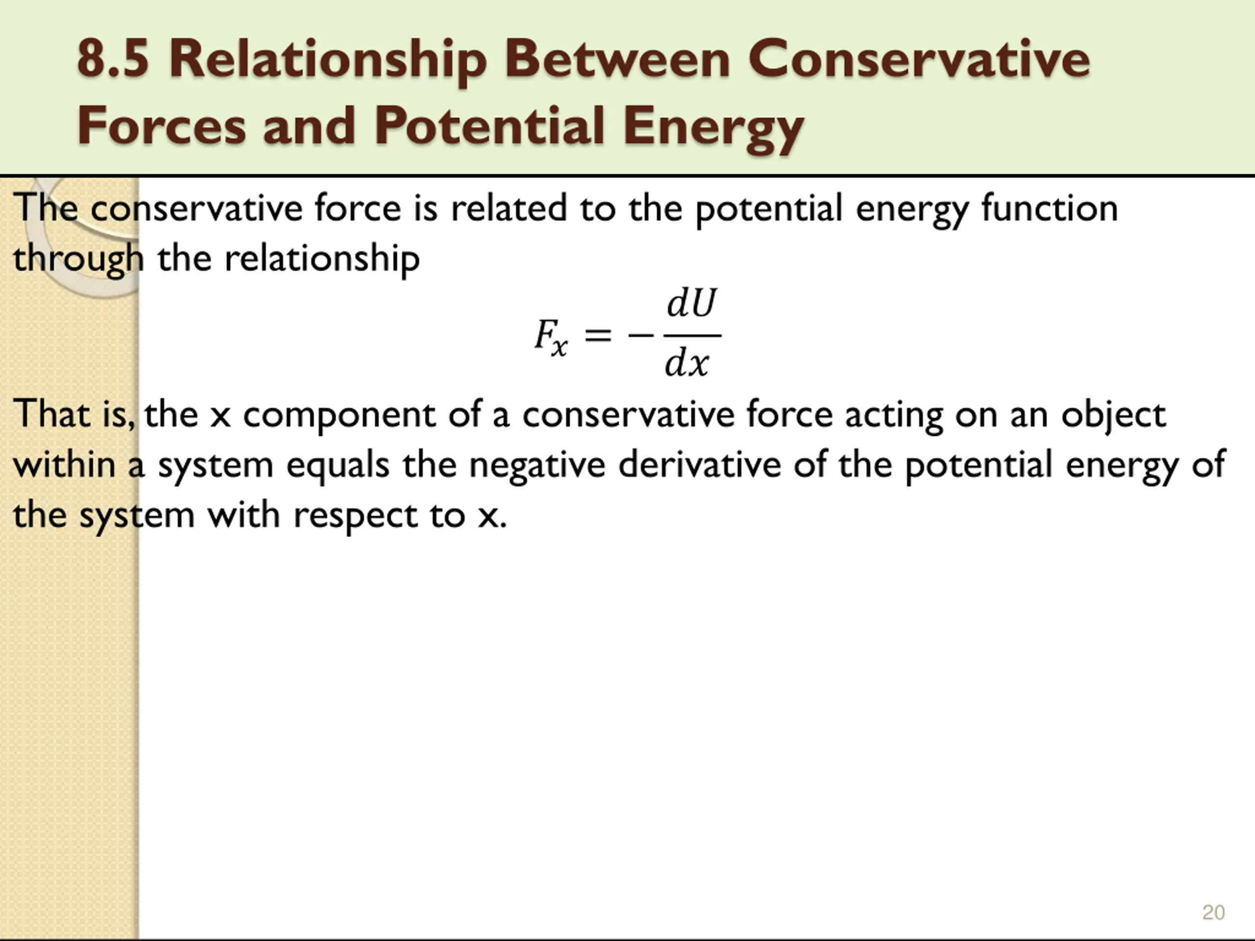 8.5 Relationship Between Conservative Forces and Potential Energy The conservative force is related to the potential energy function through the relationship ??= ?? ?? That is, the x component of a conservative force acting on an object within a system equals the negative derivative of the potential energy of the system with respect to x. 20