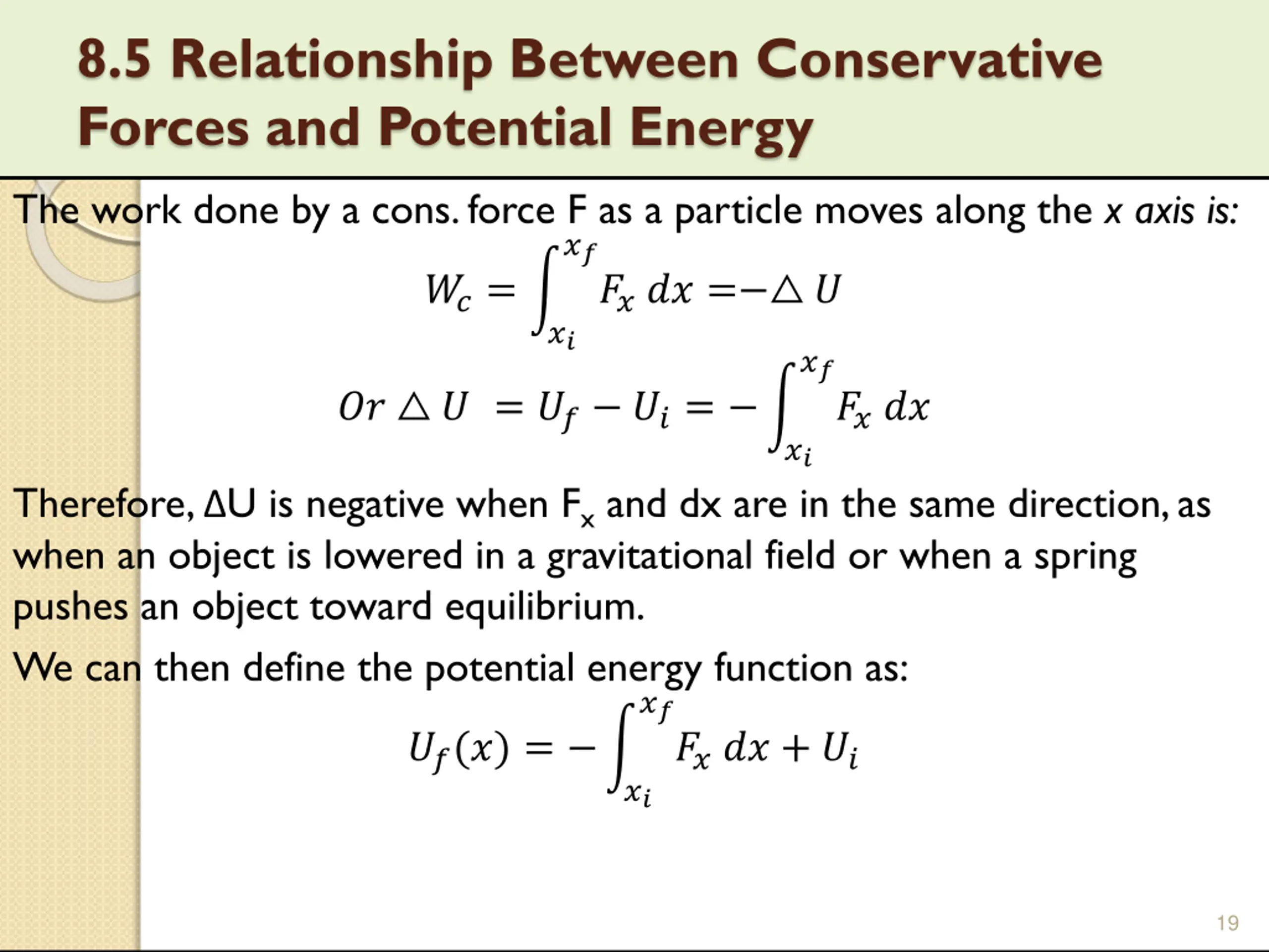 8.5 Relationship Between Conservative Forces and Potential Energy The work done by a cons. force F as a particle moves along the x axis is: ?? ?? ?? = ? ??= ?? ?? ?? ? = ?? ??= ?? ?? ?? Therefore, U is negative when Fx and dx are in the same direction, as when an object is lowered in a gravitational field or when a spring pushes an object toward equilibrium. We can then define the potential energy function as: ?? ??(?) = ?? ?? + ?? ?? 19