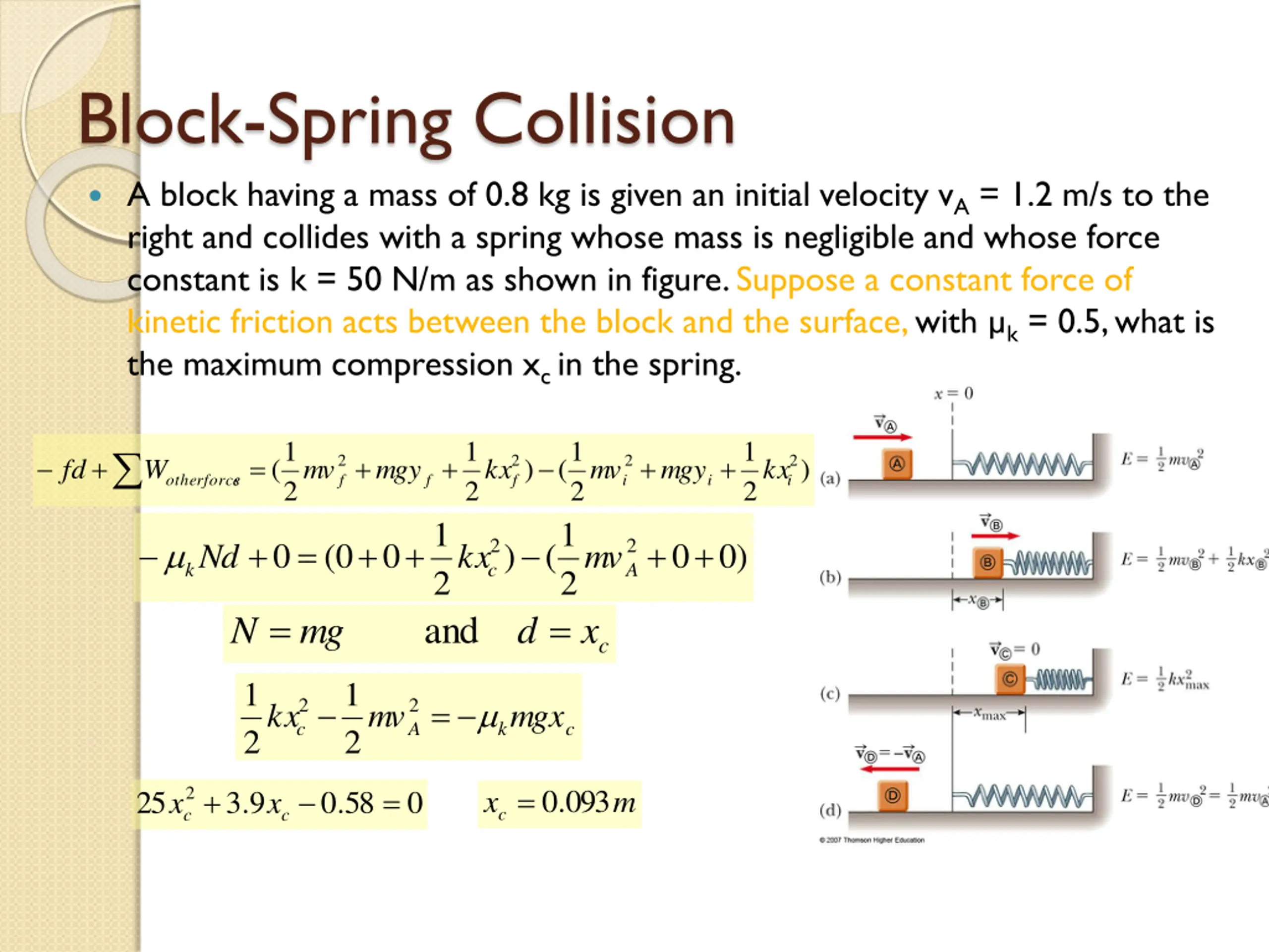 Block-Spring Collision A block having a mass of 0.8 kg is given an initial velocity vA = 1.2 m/s to the right and collides with a spring whose mass is negligible and whose force constant is k = 50 N/m as shown in figure. Suppose a constant force of kinetic friction acts between the block and the surface, with k = 0.5, what is the maximum compression xc in the spring. 1 1 1 1 + = + + + + 2 f 2 f 2 i 2 i ( ) ( ) fd otherforce W mv mgy kx mv mgy kx s f i 2 2 2 2 1 1 + = + + + ) 0 + 2 c 2 A 0 0 ( 0 ) ( 0 Nd kx mv k 2 2 = = and N mg d cx 1 1 = 2 2 kx mv mgx c A k c 2 2 = 9 . 3 + = 2 c . 0 093 xc m 25 . 0 58 0 x x c