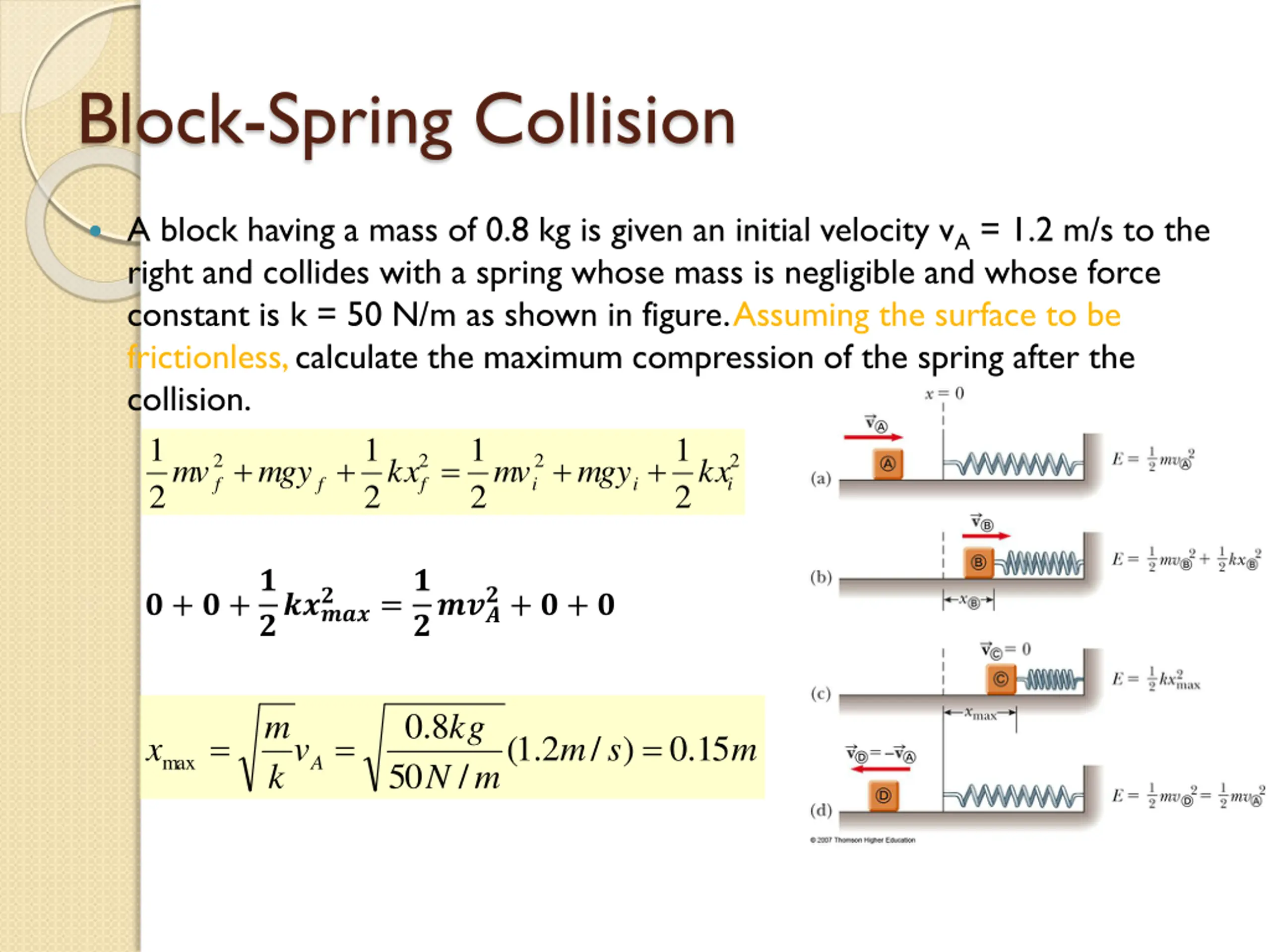 Block-Spring Collision A block having a mass of 0.8 kg is given an initial velocity vA = 1.2 m/s to the right and collides with a spring whose mass is negligible and whose force constant is k = 50 N/m as shown in figure. Assuming the surface to be frictionless, calculate the maximum compression of the spring after the collision. 1 2 2 1 1 1 + + = + + 2 f 2 f 2 i 2 i mv mgy kx mv mgy kx f i 2 2 ? + ? +? =? ?+ ? + ? ? ?????? ???? 8 . 0 m kg / = = = 2 . 1 ( / ) . 0 15 x v m s m max A 50 k N m