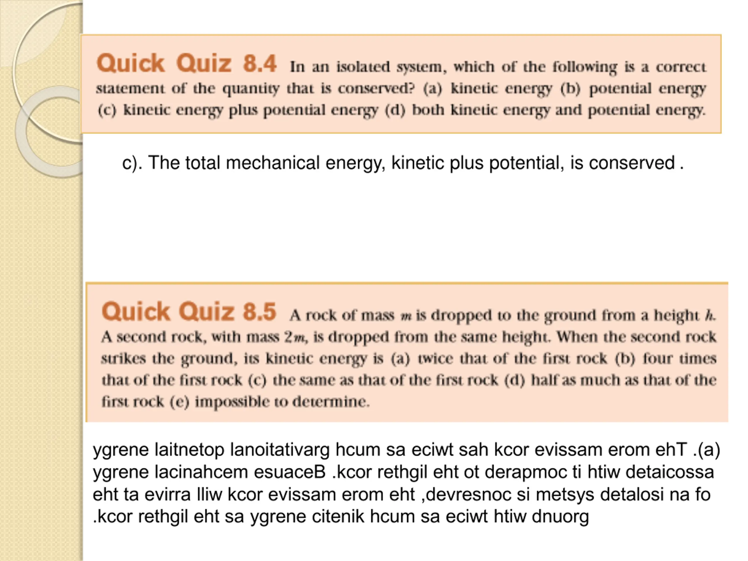 c). The total mechanical energy, kinetic plus potential, is conserved . ygrene laitnetop lanoitativarg hcum sa eciwt sah kcor evissam erom ehT .)a( ygrene lacinahcem esuaceB .kcor rethgil eht ot derapmoc ti htiw detaicossa eht ta evirra lliw kcor evissam erom eht ,devresnoc si metsys detalosi na fo kcor rethgil eht sa ygrene citenik hcum sa eciwt htiw dnuorg .
