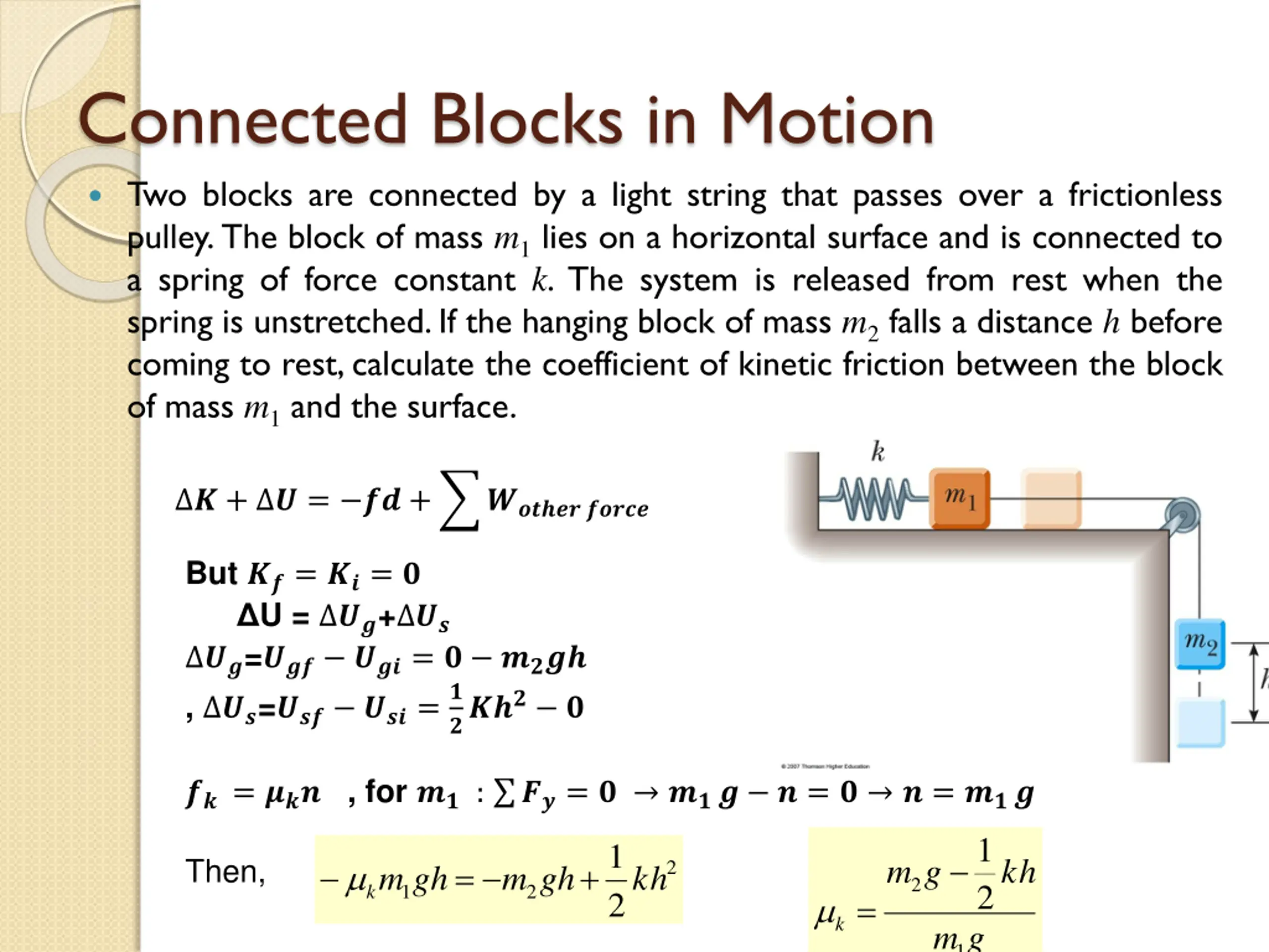 Connected Blocks in Motion Two blocks are connected by a light string that passes over a frictionless pulley. The block of mass m1 lies on a horizontal surface and is connected to a spring of force constant k. The system is released from rest when the spring is unstretched. If the hanging block of mass m2 falls a distance h before coming to rest, calculate the coefficient of kinetic friction between the block of mass m1 and the surface. ? + ? = ?? + ?????? ????? But ??= ??= ? U = ??+ ?? ??=??? ???= ? ???? , ??=??? ???=? ???? ? ?? = ??? , for ?? : ??= ? ?? ? ? = ? ? = ?? ? 1 1kh m g kh Then, = + 2 m gh m gh 2 2 1 2 k 2 = k m g 1