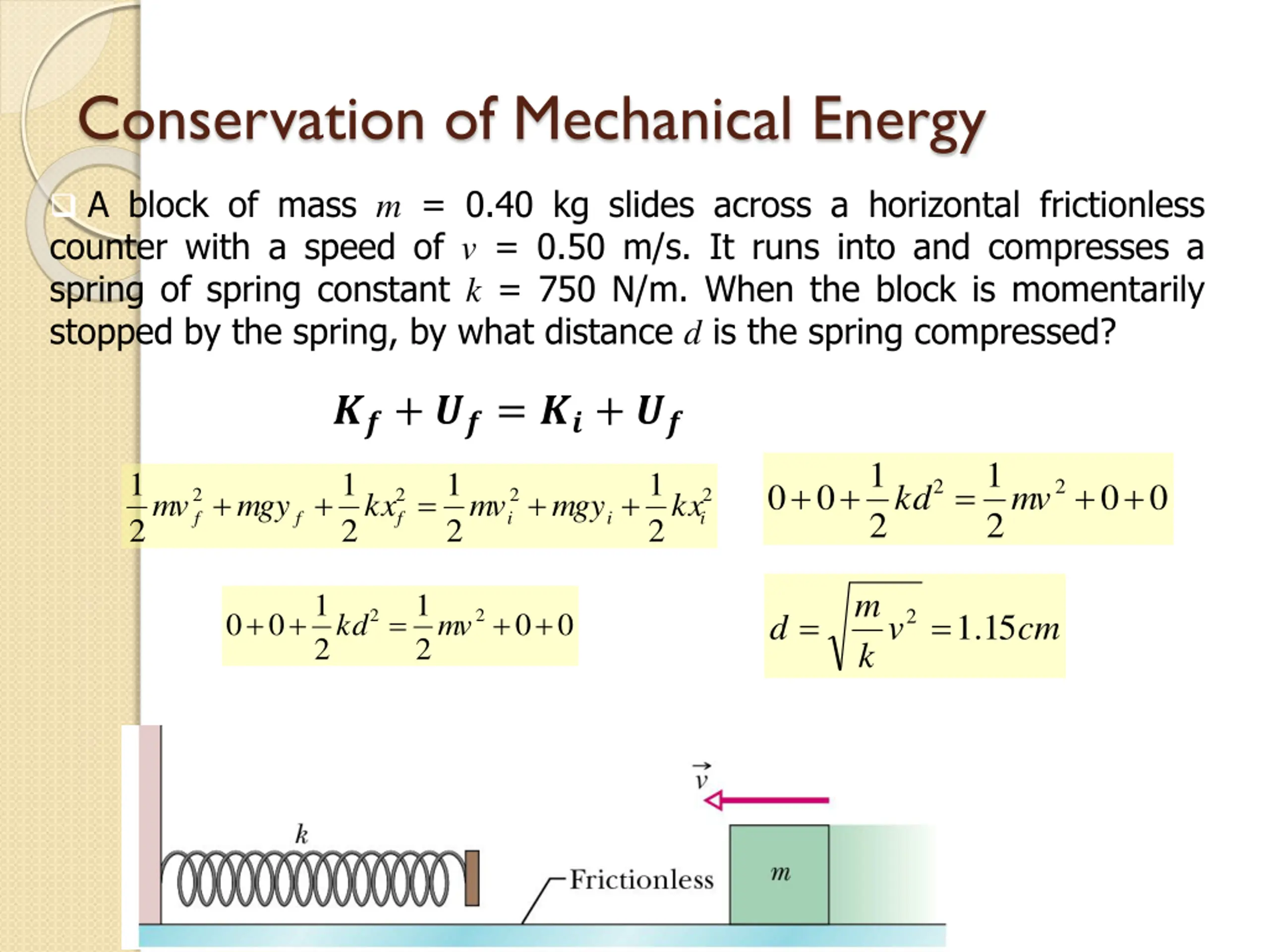 Conservation of Mechanical Energy A block of mass m = 0.40 kg slides across a horizontal frictionless counter with a speed of v = 0.50 m/s. It runs into and compresses a spring of spring constant k = 750 N/m. When the block is momentarily stopped by the spring, by what distance d is the spring compressed? ??+ ??= ??+ ?? 1 1 1 1 1 1 + + = + + 2 2 0 0 0 0 kd mv + + = + + 2 f 2 f 2 i 2 i mv mgy kx mv mgy kx 2 2 f i 2 2 2 2 m 1 1 = 2= + + = + + 2 2 . 1 15 0 0 0 0 d v cm kd mv 2 2 k