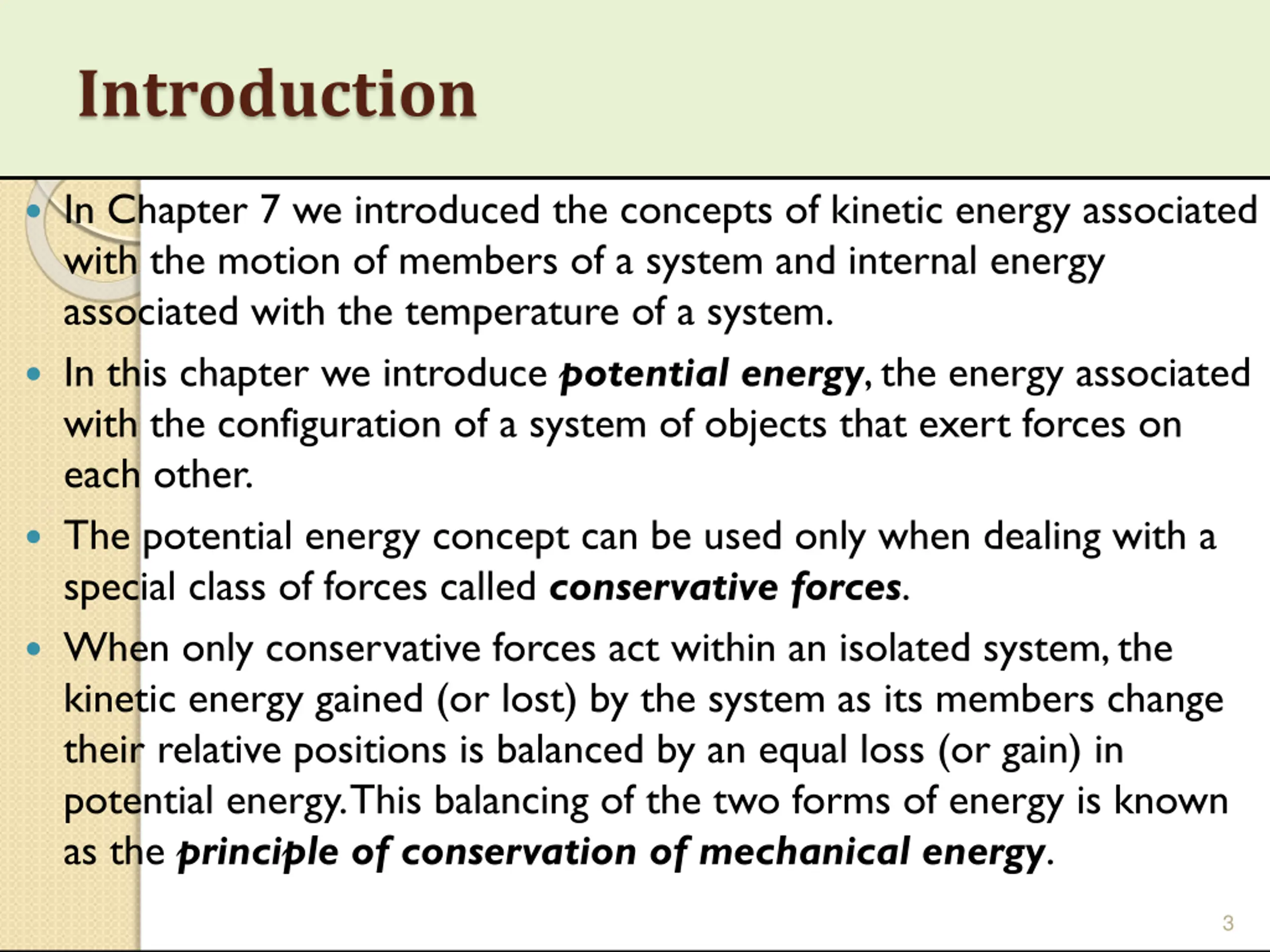 Introduction In Chapter 7 we introduced the concepts of kinetic energy associated with the motion of members of a system and internal energy associated with the temperature of a system. In this chapter we introduce potential energy, the energy associated with the configuration of a system of objects that exert forces on each other. The potential energy concept can be used only when dealing with a special class of forces called conservative forces. When only conservative forces act within an isolated system, the kinetic energy gained (or lost) by the system as its members change their relative positions is balanced by an equal loss (or gain) in potential energy. This balancing of the two forms of energy is known as the principle of conservation of mechanical energy. 3
