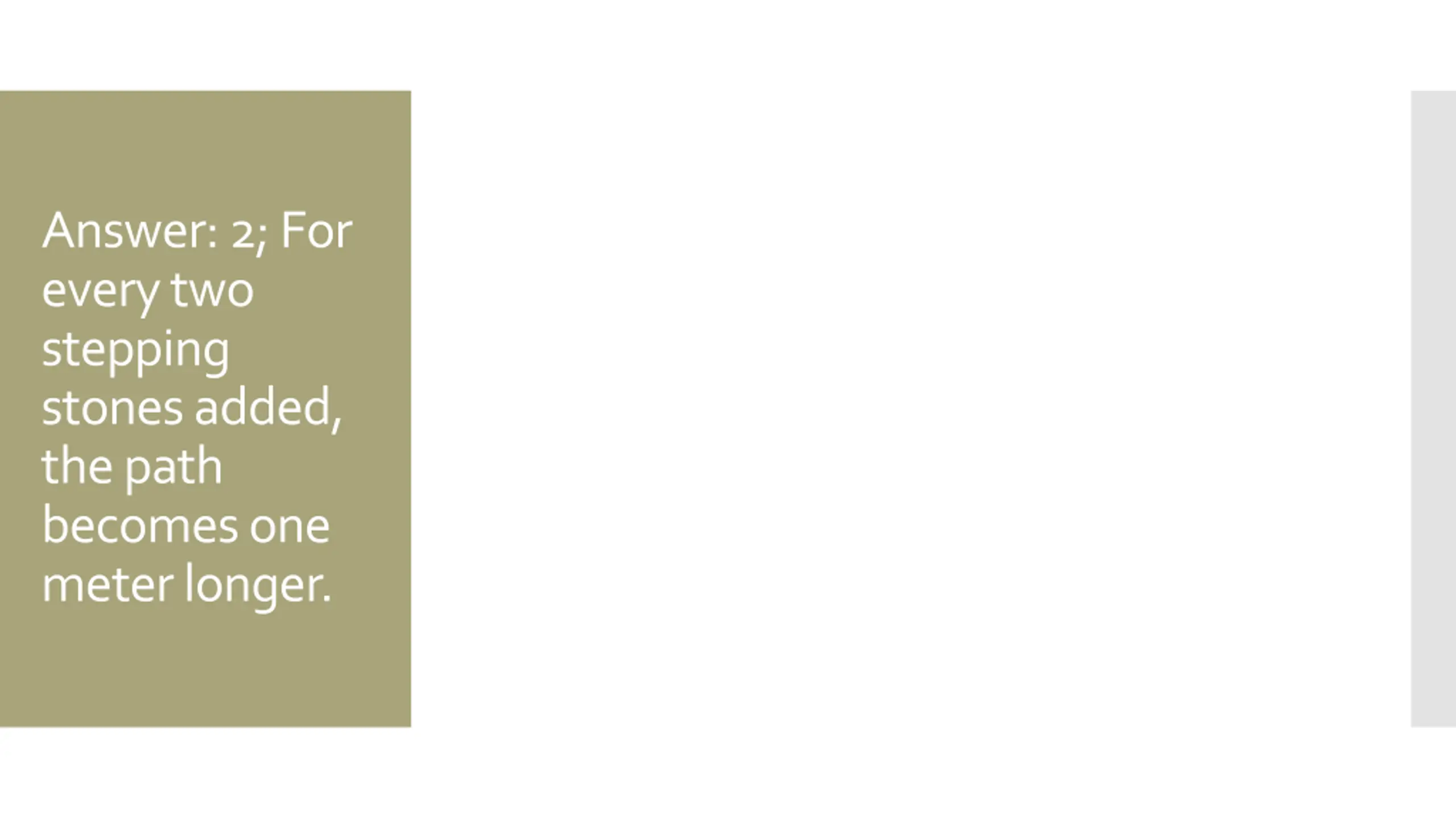 Answer: 2; For every two stepping stones added, the path becomes one meter longer.