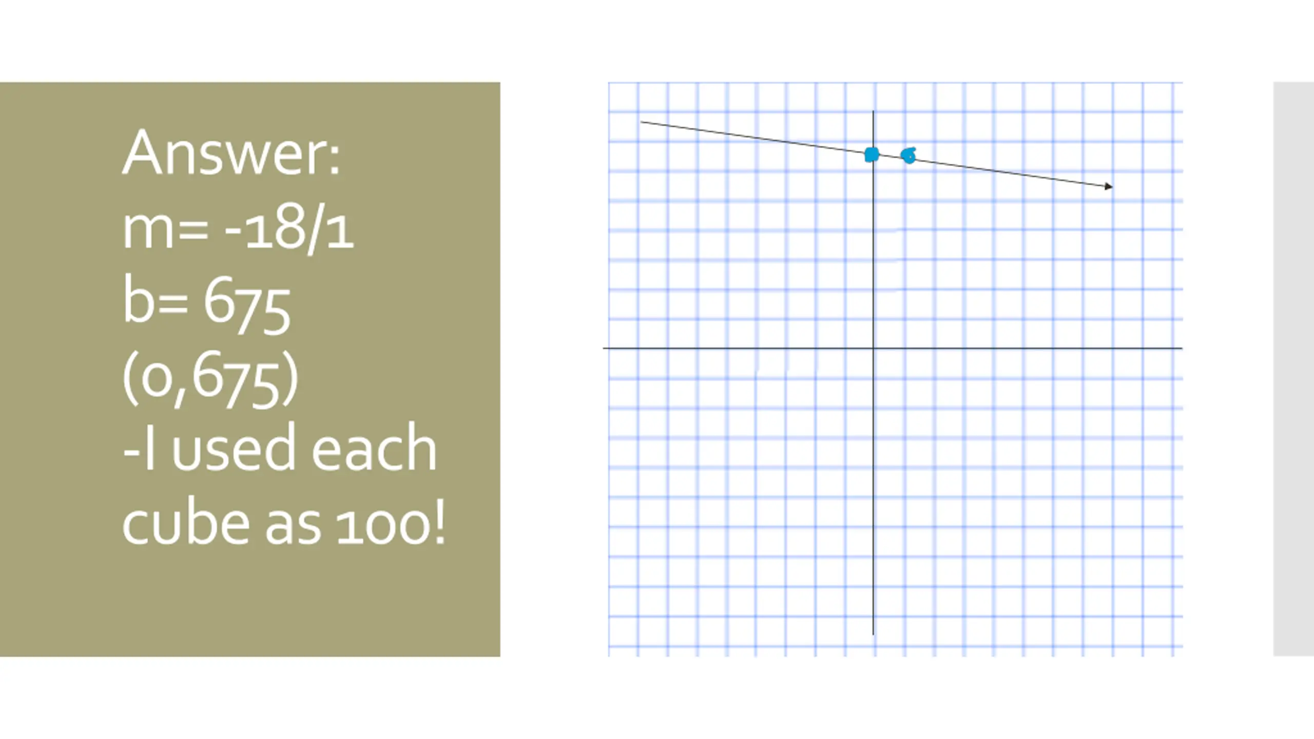 Answer: m= -18/1 b= 675 (0,675) -I used each cube as 100!